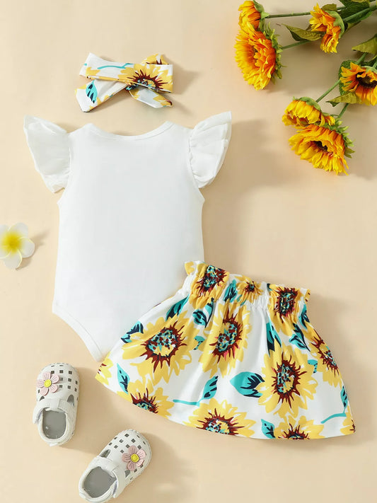 Children's Ruffled Bodysuit and Sunflower Skirt Set with Headband
