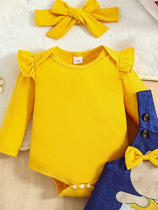 Children's Ruffled Bodysuit and Overall Dress Set with Headband