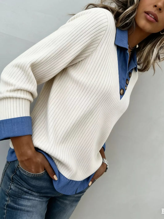 Denim Trim Ribbed Knit Top