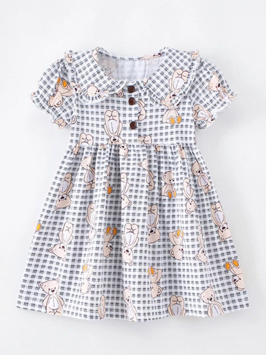 Children's Gingham Teddy Bear Print Peter Pan Collar Dress