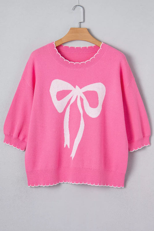 Ribbon Bow Print Contrast Stitch Trim Drop Shoulder Sweater