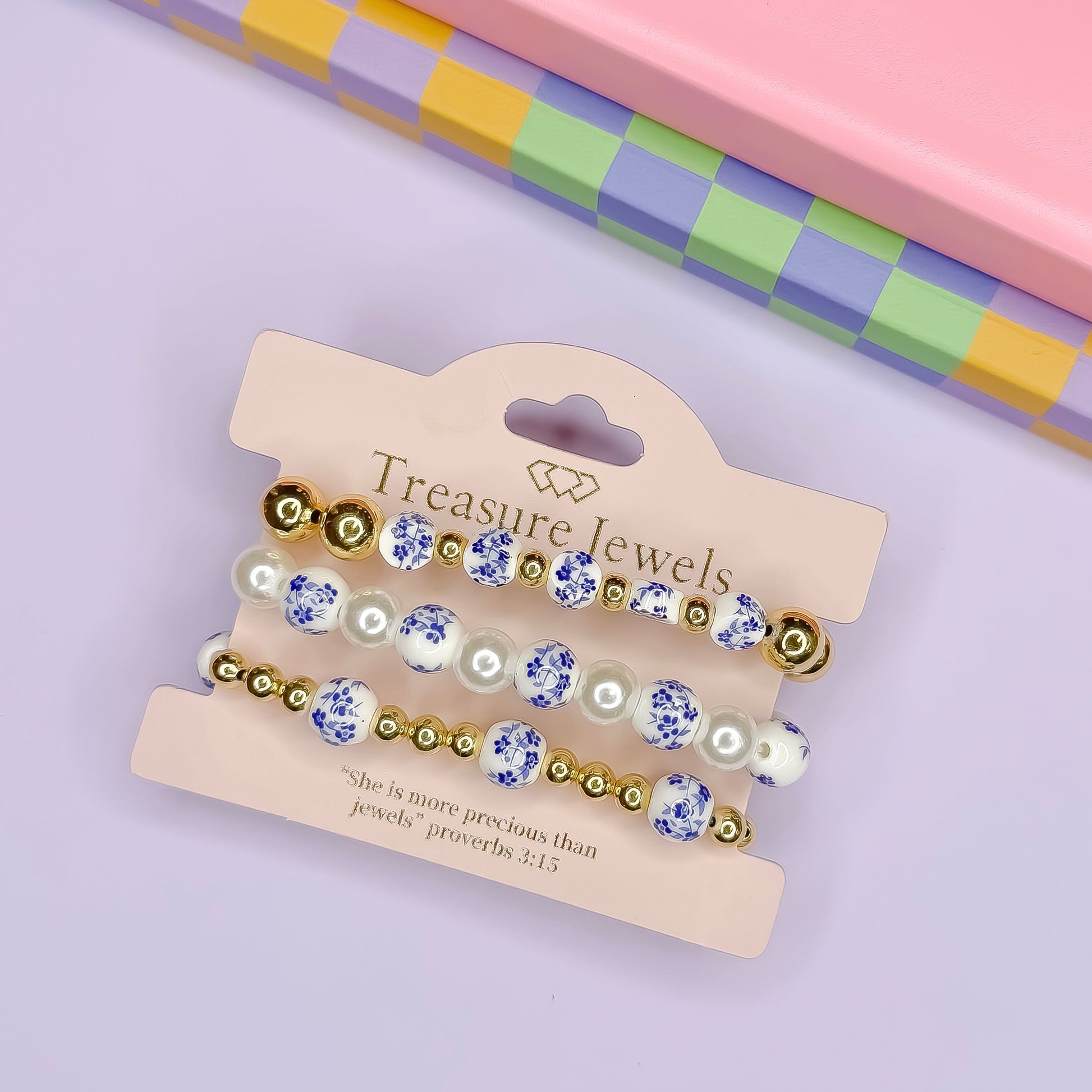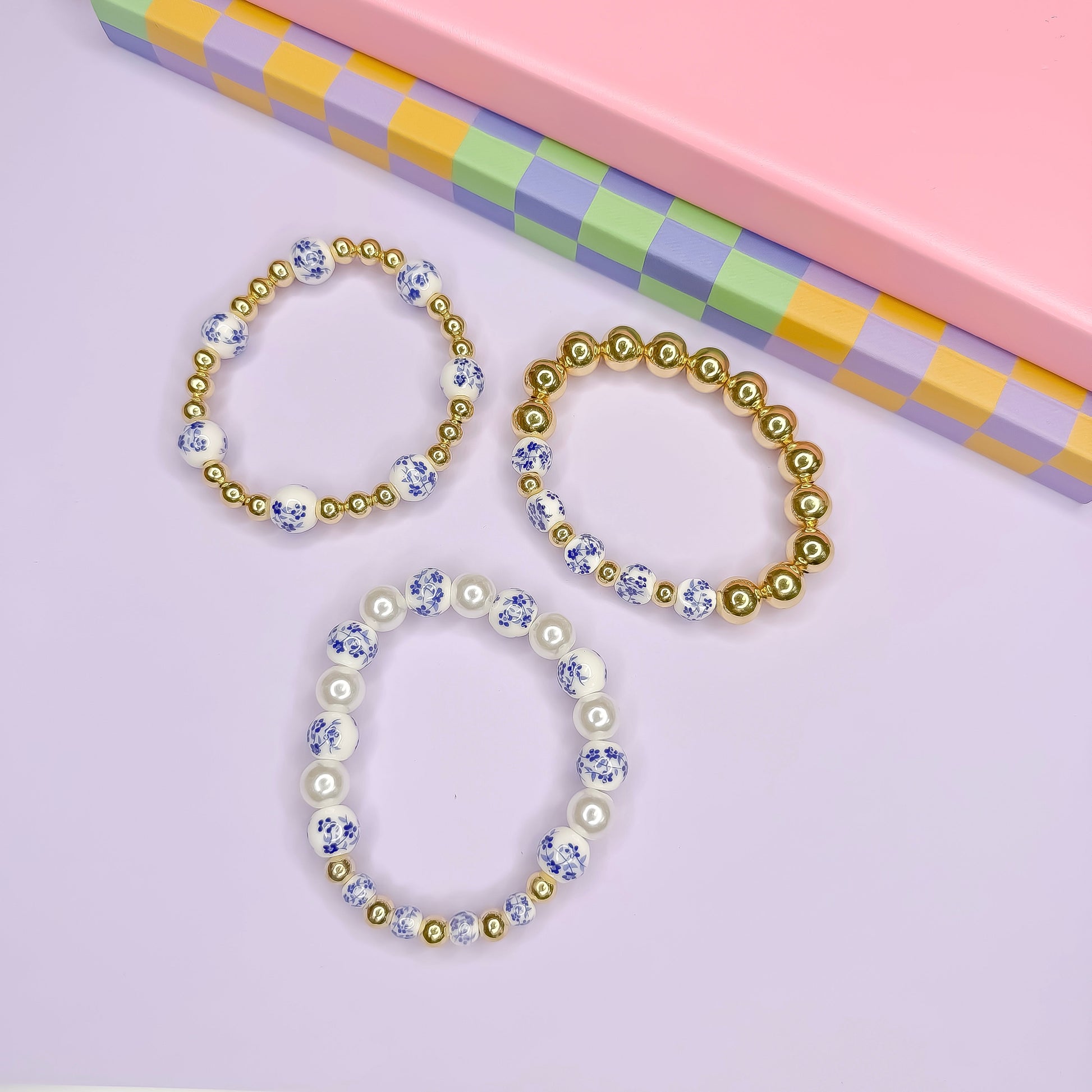 * Charming, timeless, and a little nostalgic — delicate blue-and-white floral beads, classic pearls, and gleaming gold accents. It’s the perfect blend of vintage romance and modern elegance, ready to dress up your wrist with a touch of sweet sophistication.