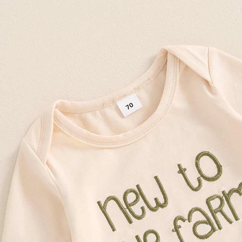 Baby Boys 3Pcs New To The Farm Long Sleeve O-Neck Embroidery Romper with Tractor Print Pants Hat Outfit Set