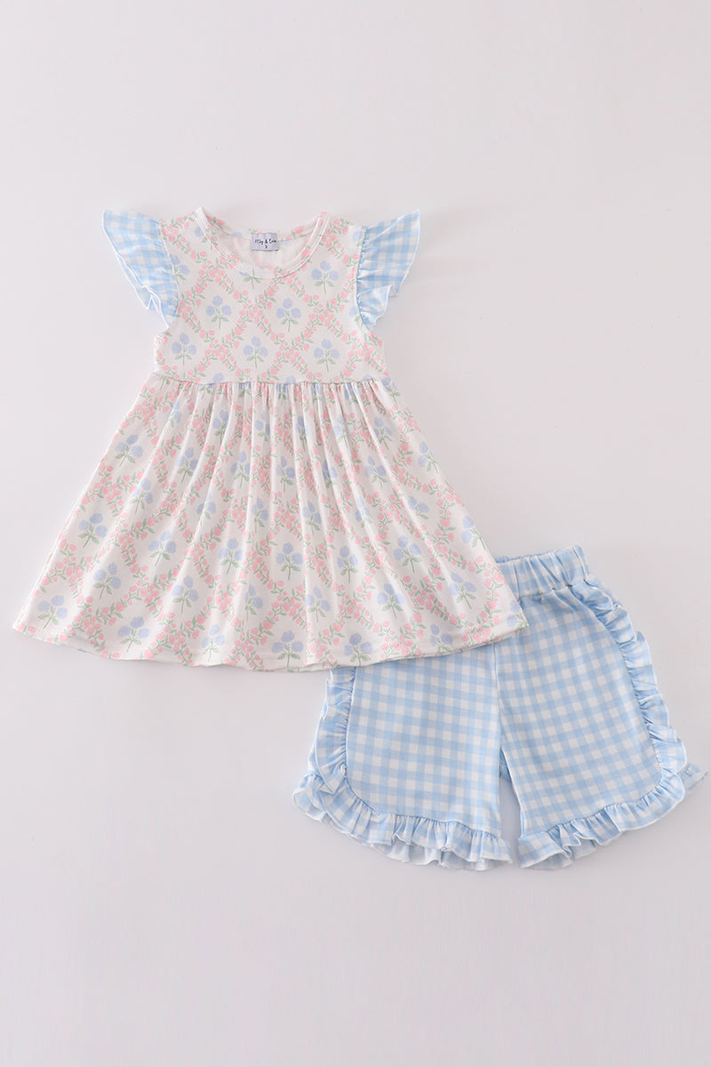 Get your little fashionista ready for summer with this blue hydrangea print girl set. Featuring a playful floral design, this set is perfect for any fun occasion. Let her embrace her unique style with this quirky and cute outfit. (Warning: may cause excessive twirling and cute overload!)