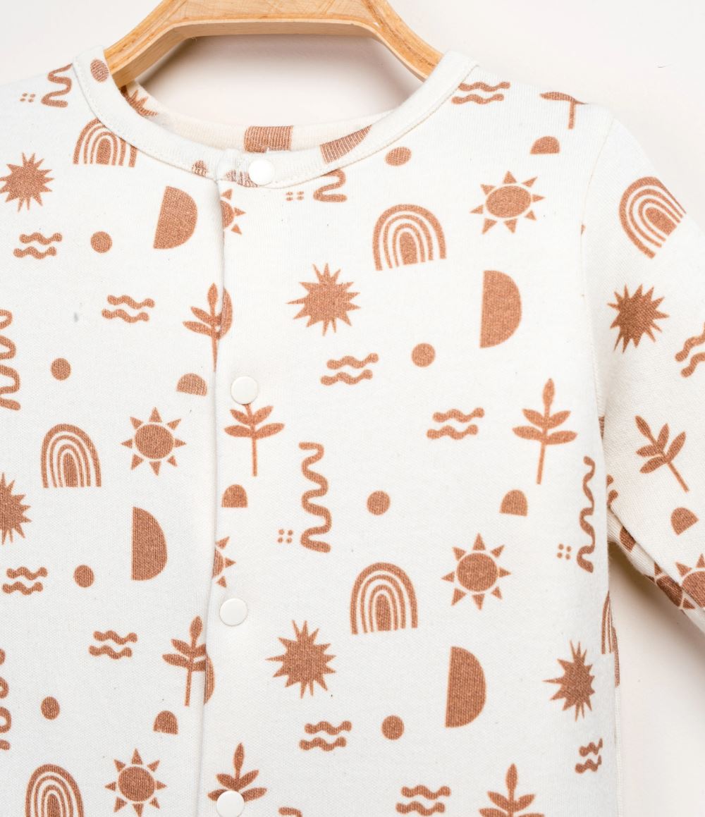 Wrap your little one in cozy comfort and boho charm with our Bohemian Cotton Footed Romper. Featuring a warm earthy print of suns, rainbows, and nature-inspired motifs, this romper is perfect for day or night. Made from 100% premium cotton, it’s soft, breathable, and gentle on delicate baby skin. The full-length design with snap-button closures makes diaper changes easy, while the built-in feet keep tiny toes snug and warm.