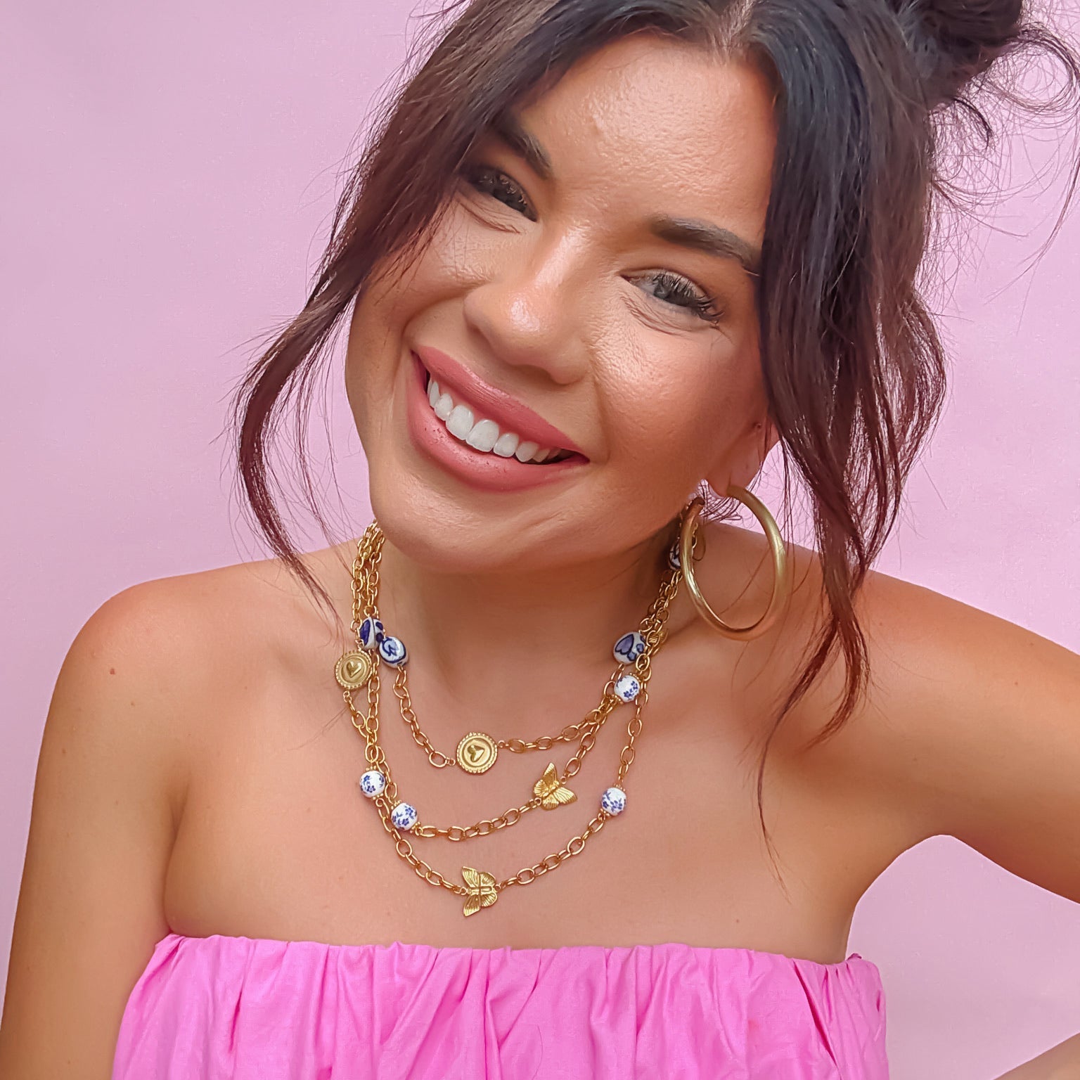 Golden chains, fluttering butterflies, and dreamy blue-and-white beads come together in this playful layered necklace. Featuring ceramic-style heart charms, floral spheres, and vintage medallion accents, the Butterfly Bijou Necklace is a charming blend of whimsy and elegance. Perfect for adding a little sparkle and sweetness to your everyday look.