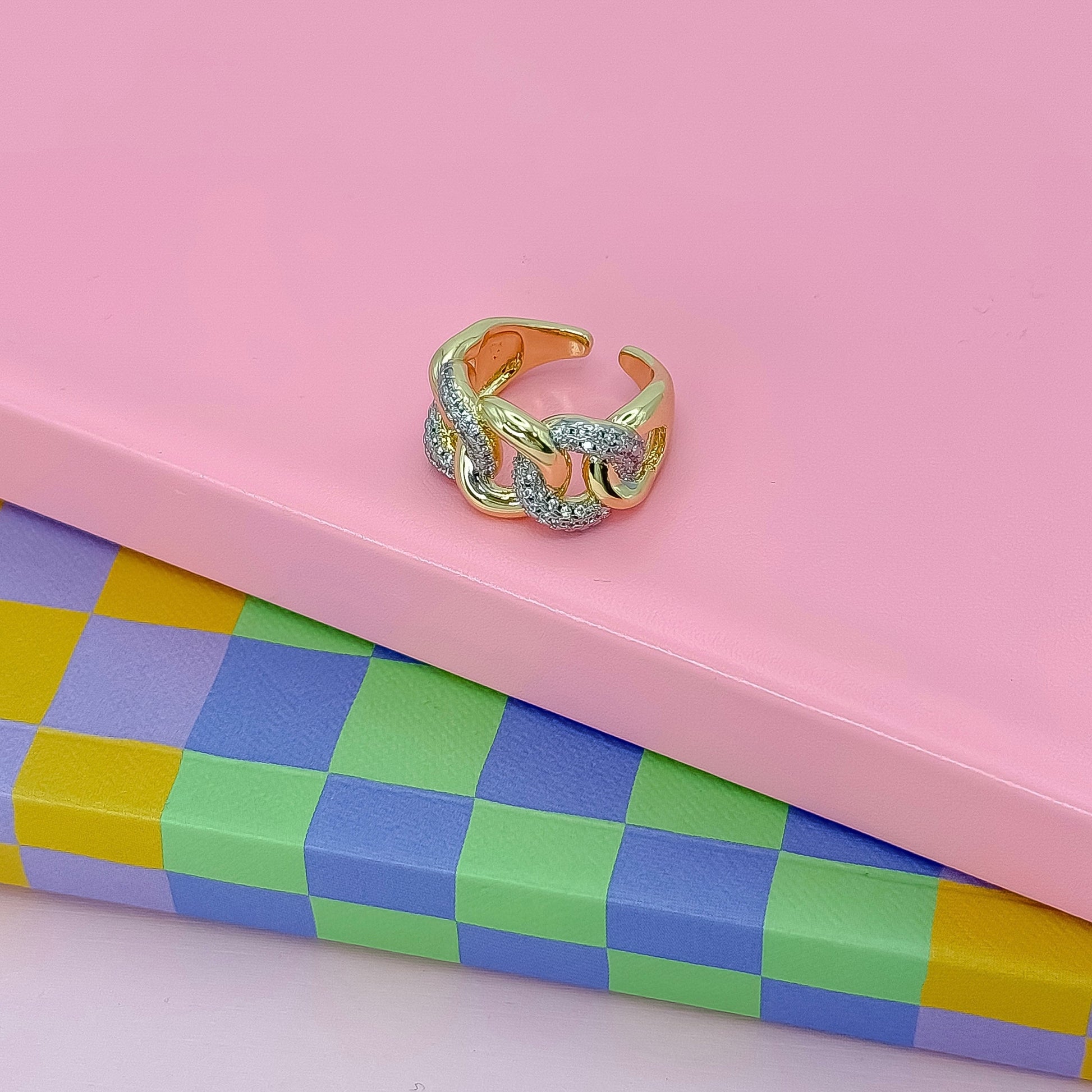 - A bold chain-link ring with gold and crystal accents. Sleek, sparkly and perfect for making a statement.