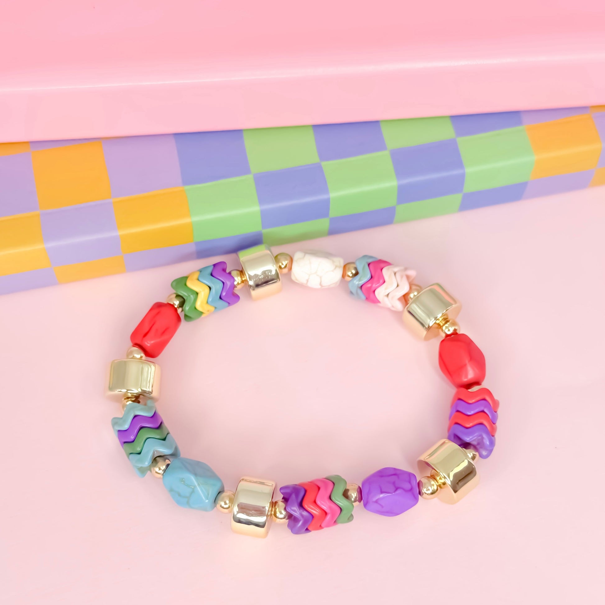- Bright, bold, and bursting with charm. Your new go-to for a splash of personality! With shiny gold barrels, rainbow zigzags, and playful stone beads, this stretch bracelet is a colorful celebration on your wrist.