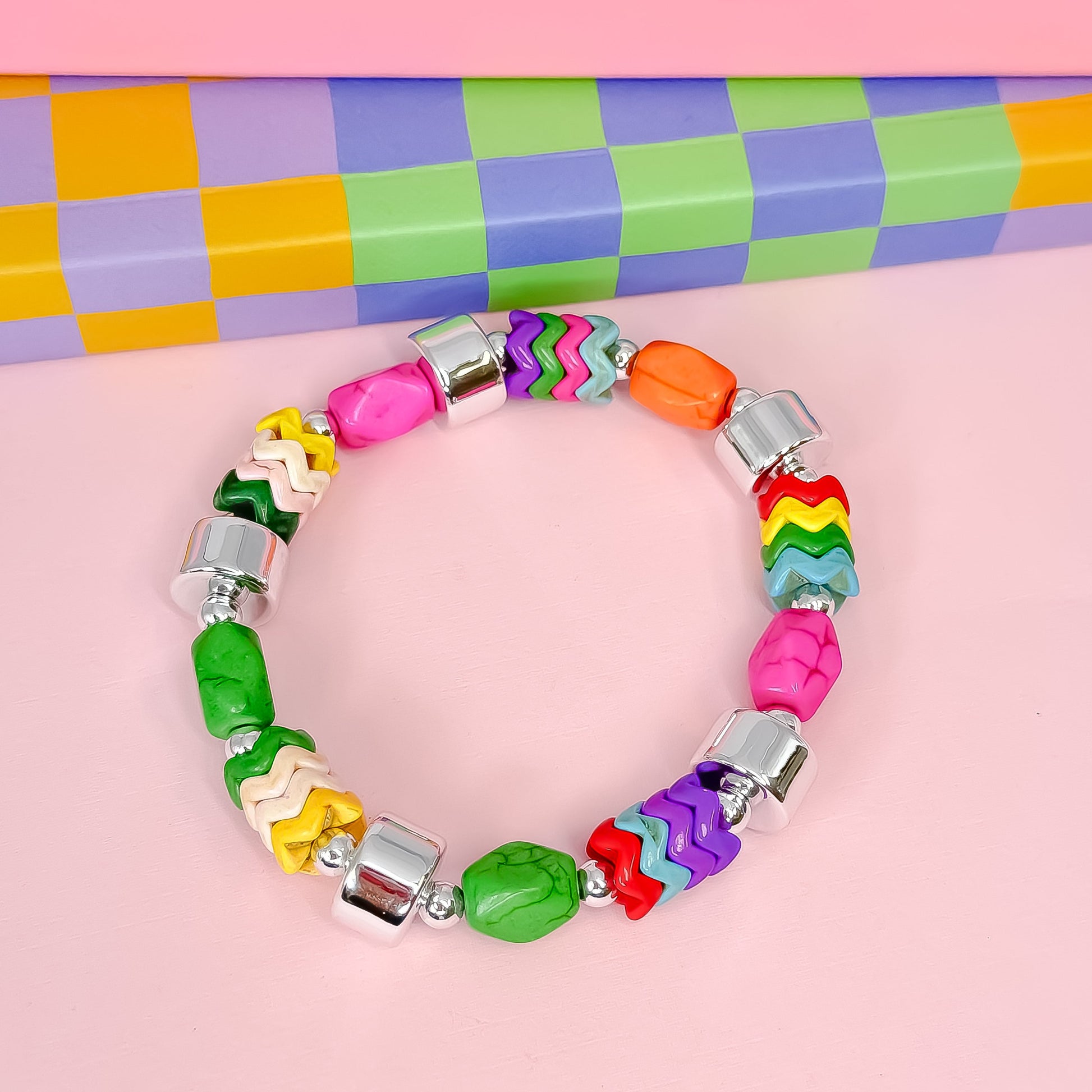 - Bright, bold, and bursting with charm. Your new go-to for a splash of personality! With shiny silver barrels, rainbow zigzags, and playful stone beads, this stretch bracelet is a colorful celebration on your wrist.