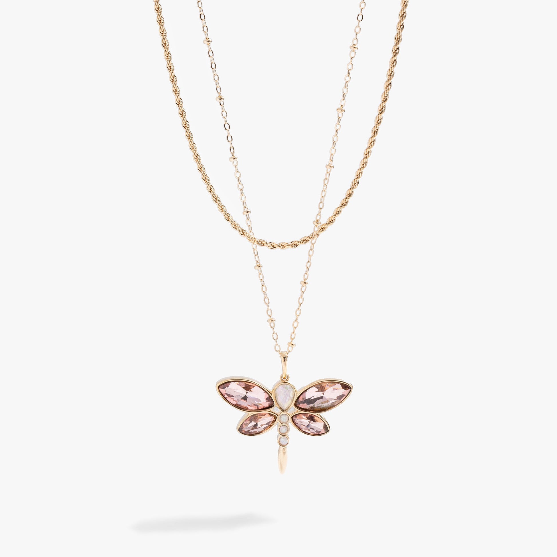 The dragonfly represents the delicate balance between strength and agility, inspiring us to move forward with courage, no matter the obstacles in our path. This Crystal Dragonfly Double Layer Necklace features a beautifully crafted white opal and light rose crystal dragonfly with marquise, teardrop and round cut crystals on a delicate cable chain necklace with a French rope accent necklace layer.