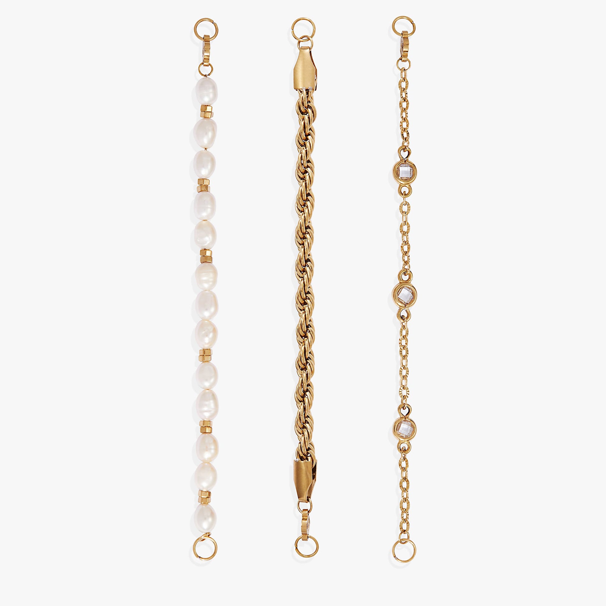 Show off your layered look with this Stranded™ Crystal and Pearl Bracelet Set, which features three bracelet strands. One has freshwater pearls and metal accents, one has a rope chain, and one has double-sided glass crystal stones on a chain bracelet. The Stranded™ Collection features an all-new, interchangeable design. Bracelet strands attach to an adjustable length keeper, included with the set. Swap out strands from different pieces and combine them to make a style that’s all your own.