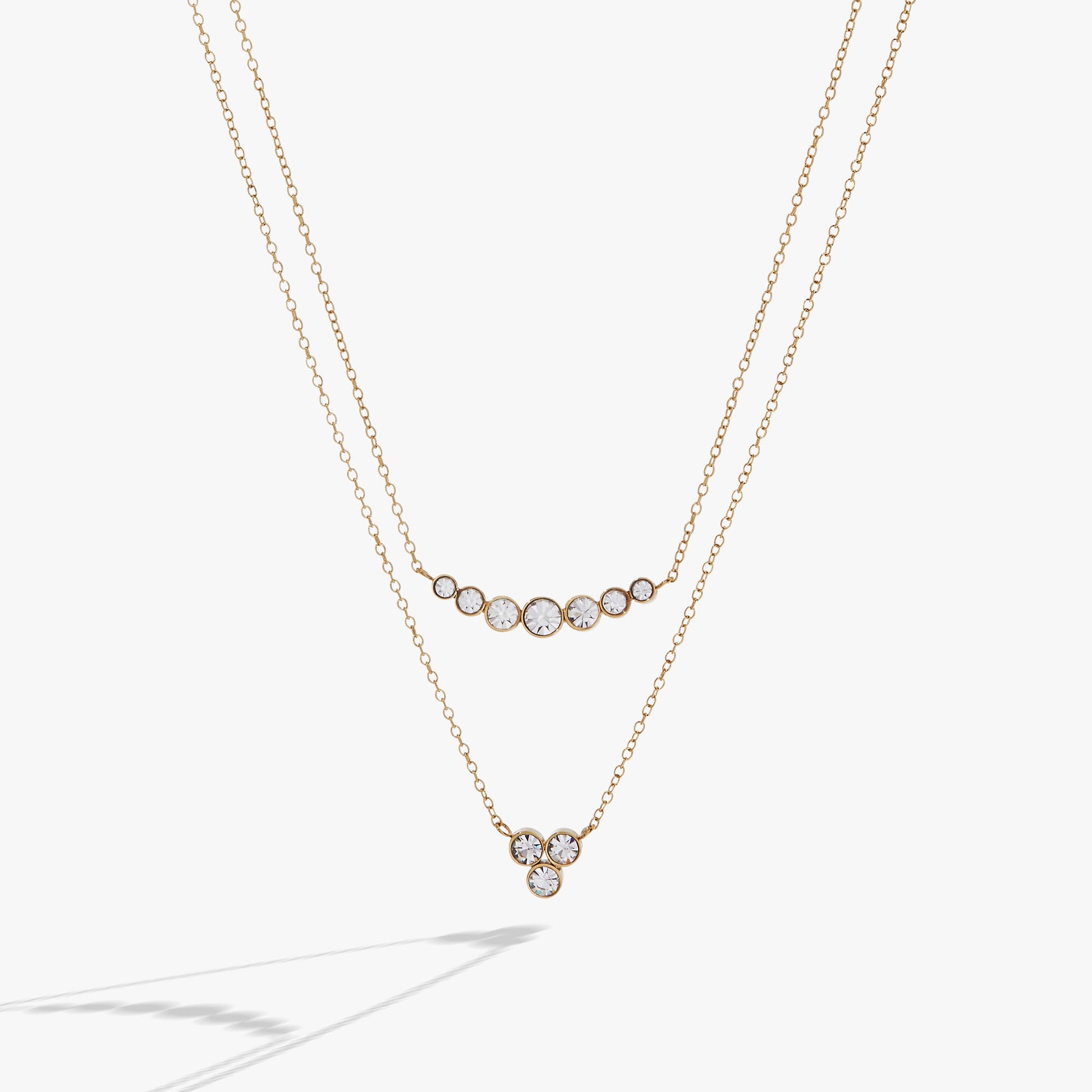 Create a perfectly layered neck with just one piece of jewelry. This Double-Layer Crystal Necklace features two chains: one has seven crystals in graduated sizes, and the other features a trio of matching crystals. Both are attached to one adjustable-length closure. Wear it to dress up an outfit, or for a touch of everyday sparkle.