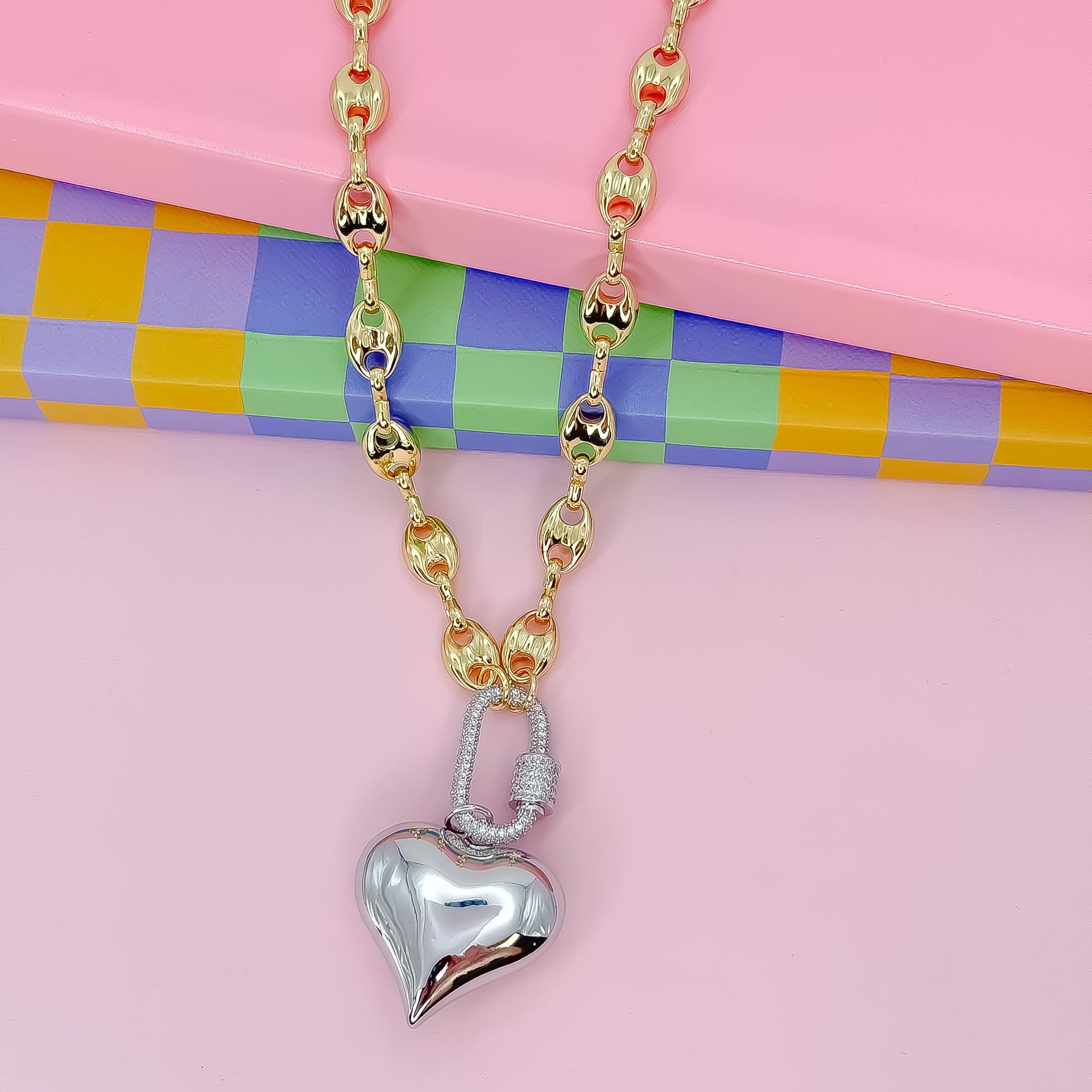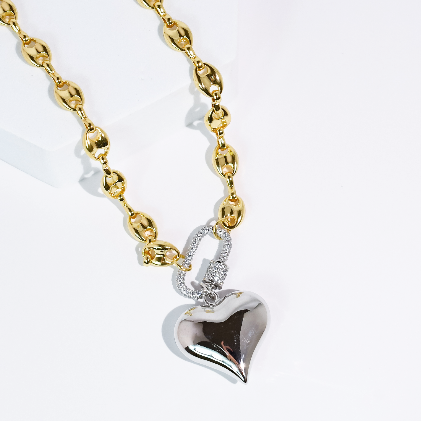 • A bold two-tone necklace featuring a gold statement chain and a shiny silver heart pendant—perfect for mixing metals with a touch of glam.