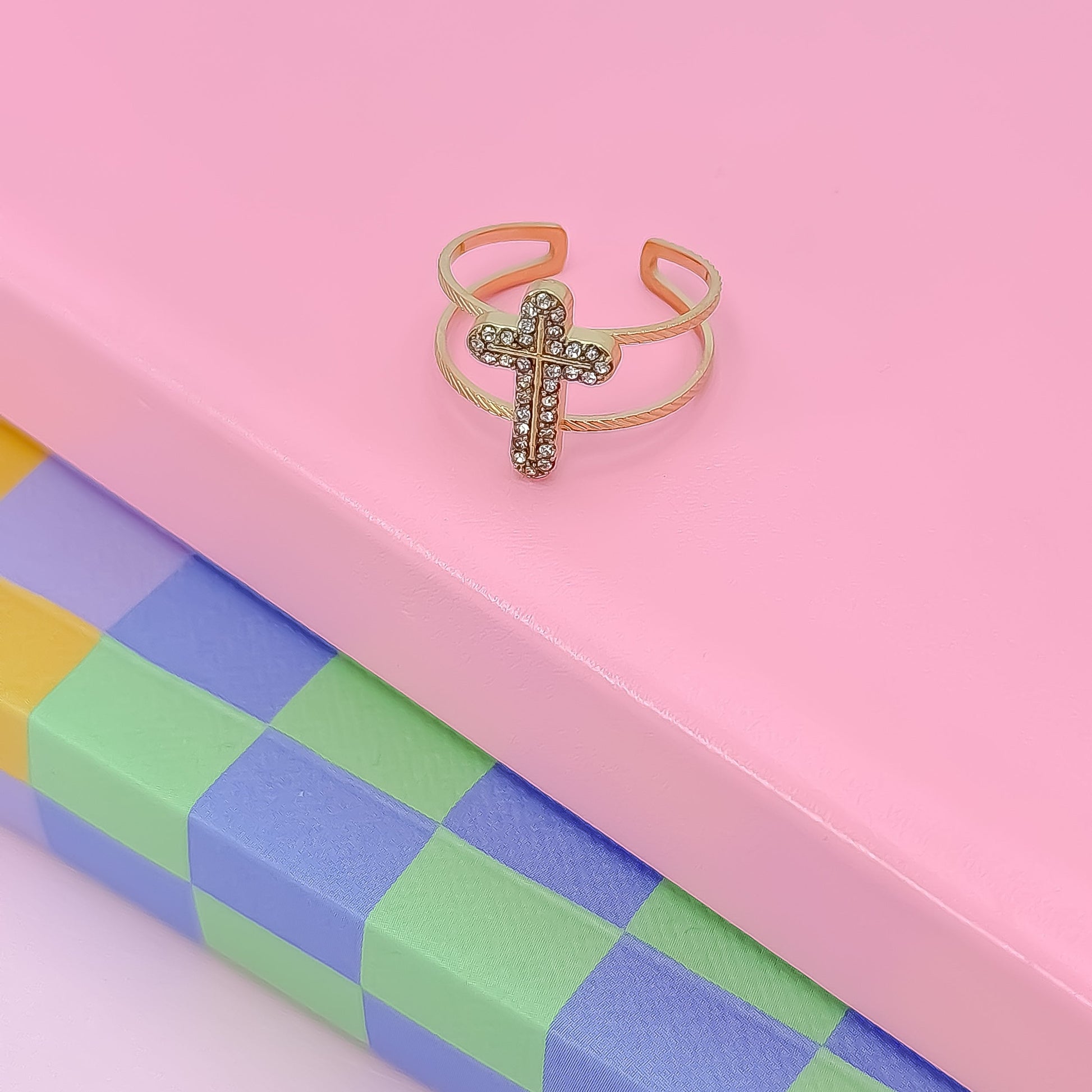 - Let your faith shine! Features a radiant cross centerpiece encrusted with shimmering crystals, all set on a delicate double band. It's a meaningful touch of sparkle that pairs devotion with style.