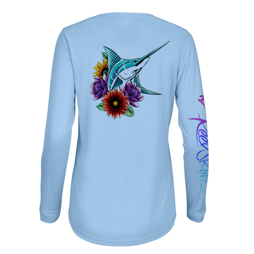 Reelskinz Long Sleeve V-NECK shirts are manufactured for extreme comfort and flexibility. All our long sleeve high performance fishing shirts are all SPF rated 50, and made from the most comfortable, Moisture wicking, and lightest fabrics in the industry. The polyester polyex and 8 way stretch recoil technology also allows for extreme flexibility, quick drying and cooling capabilities. All white shirts are bleach friendly and will not effect colors or prints.