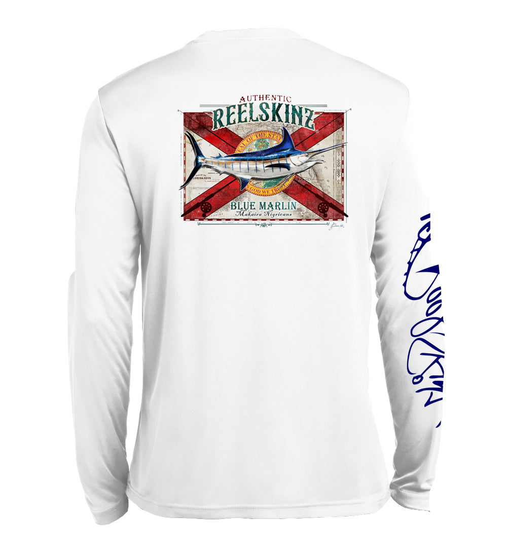 Reelskinz Long Sleeve fishing shirts are manufactured for extreme comfort and flexibility. All our long sleeve high performance fishing shirts are all SPF rated 50, and made from the most comfortable, Moisture wicking, and lightest fabrics in the industry. The polyester polyex and 8 way stretch recoil technology also allows for extreme flexibility, quick drying and cooling capabilities. All white shirts are bleach friendly and will not effect colors or prints.