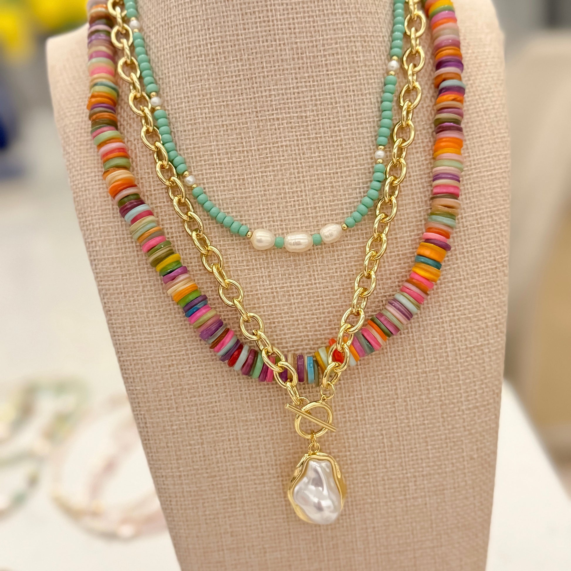 Elevated and effortlessly chic, the Golden Drift Pearl Necklace features a bold gold chain paired with a sculptural baroque pearl wrapped in a wavy gold frame. The toggle clasp adds a modern touch, making it the perfect statement piece for day-to-night styling. It’s the definition of coastal luxe — refined, radiant, and ready to shine.