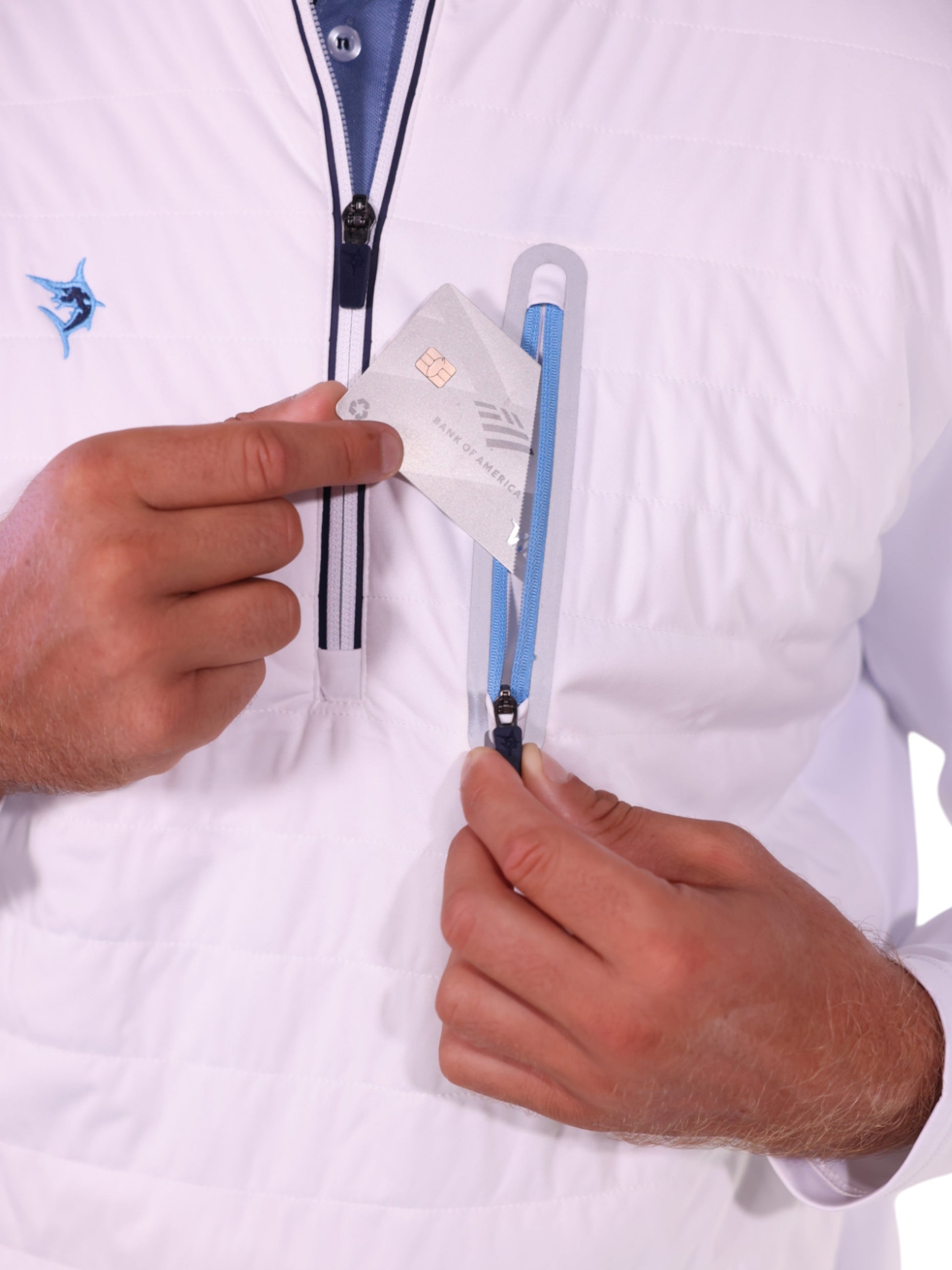 Style meets functionality. The front side offers water resistant fabric and the sleeves and backside is constructed with our scuba fabric. This offers protection from the elements, function for activity and all-day comfort. The front hand zippered pockets extend all the way through giving this a pouch pocket style with full body length. Great for those chilly days where you want to keep your hands warm. We also added an insert pocket that you can add a hand warmer to add extra heat. Left chest pocket with waterproof zipper and embroidered logo.