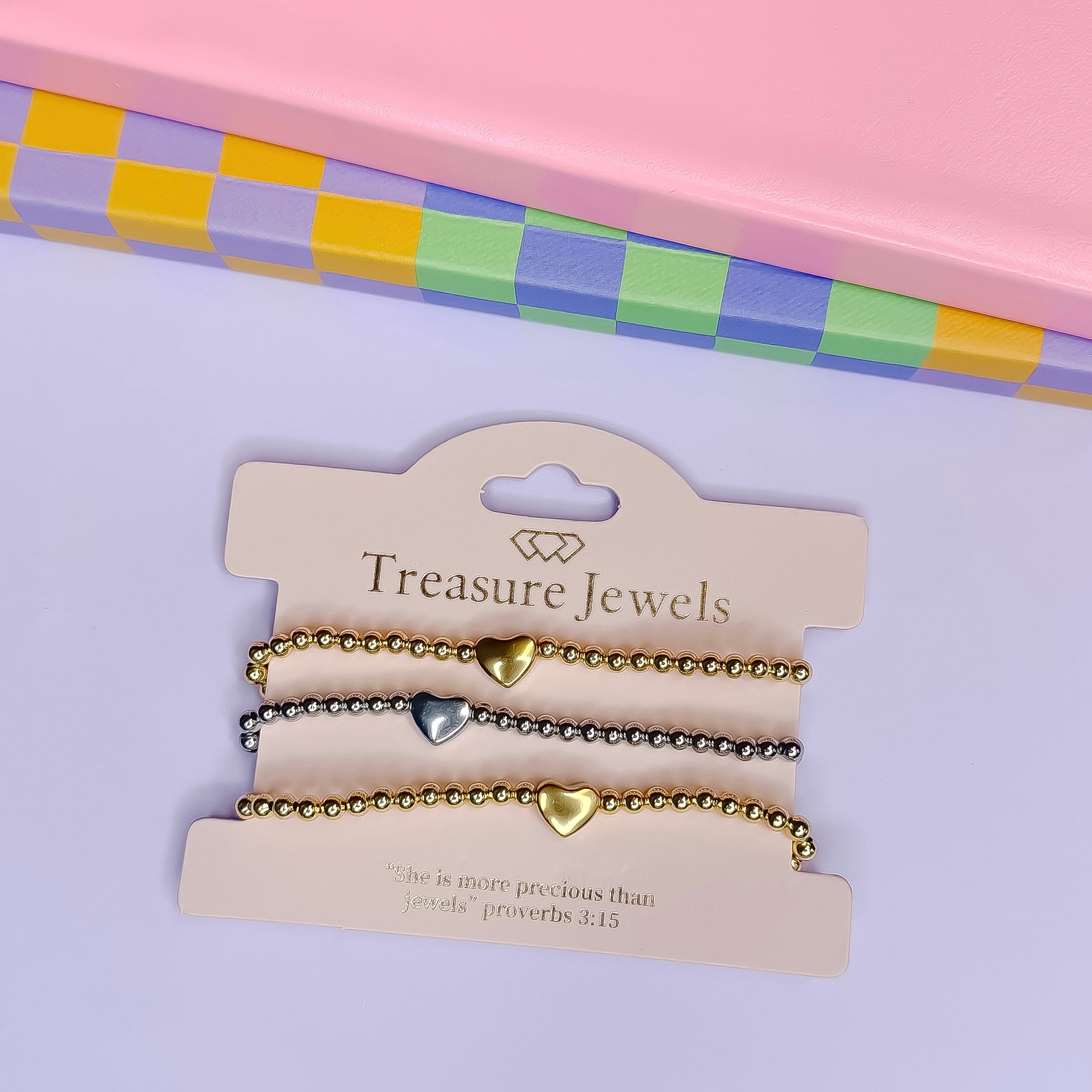 Simple, sweet, and full of love — the Heartfelt Bracelet Set features delicate metallic beads and a charming heart accent for a look that’s effortlessly chic. With gold and silver options, these stretchy bracelets are perfect for stacking, gifting, or wearing solo when you want just a little extra love on your wrist.