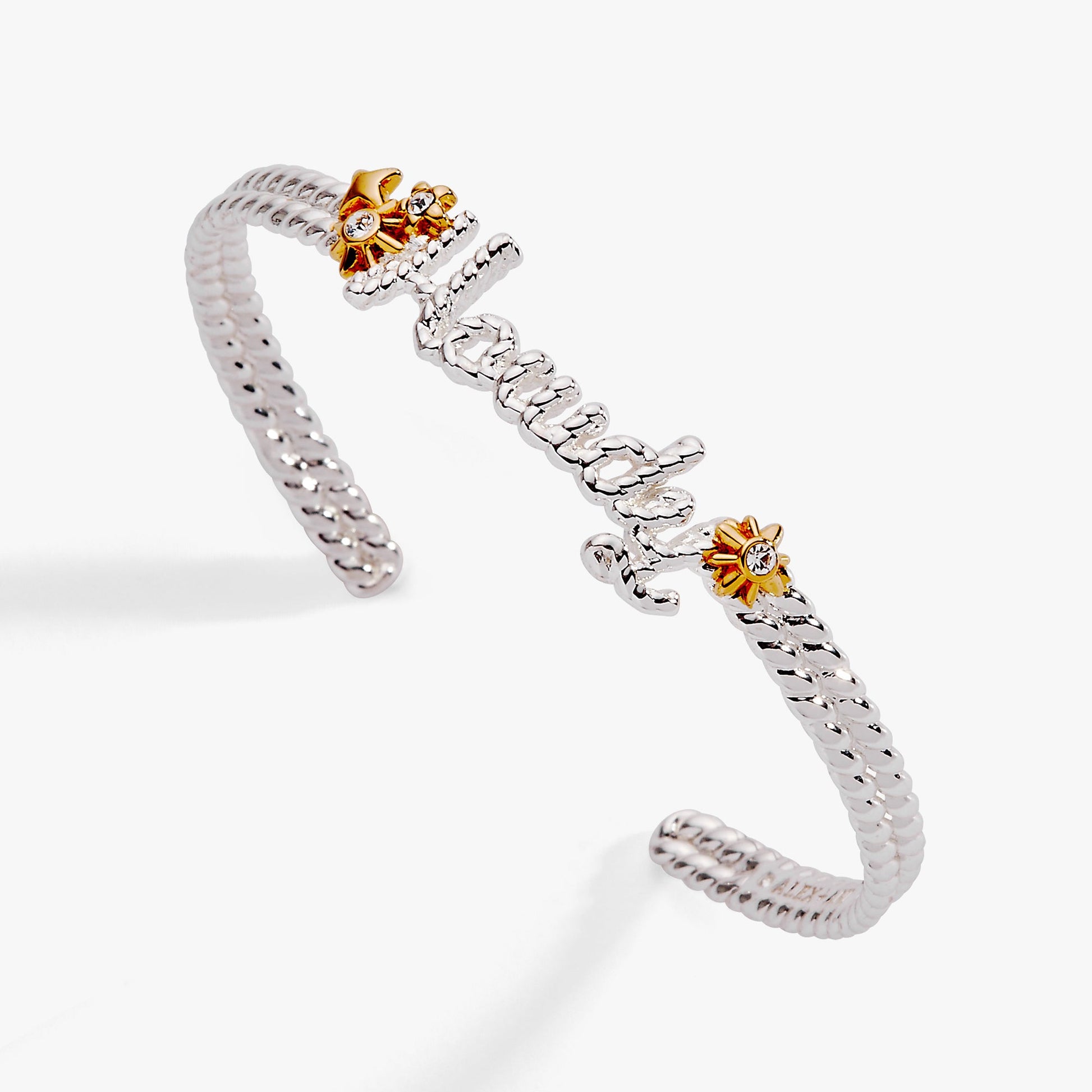 This two-tone plated cuff features a rope-textured base and a playful "howdy" script adorned with gold-plated faceted stars and sparkling clear crystals. Perfect for fans of western style and country music, it lets you unleash your inner rhinestone cowgirl with a touch of celestial charm. Its versatile two-tone finish adds a western twist to any bracelet stack, yet it's bold enough to shine solo.