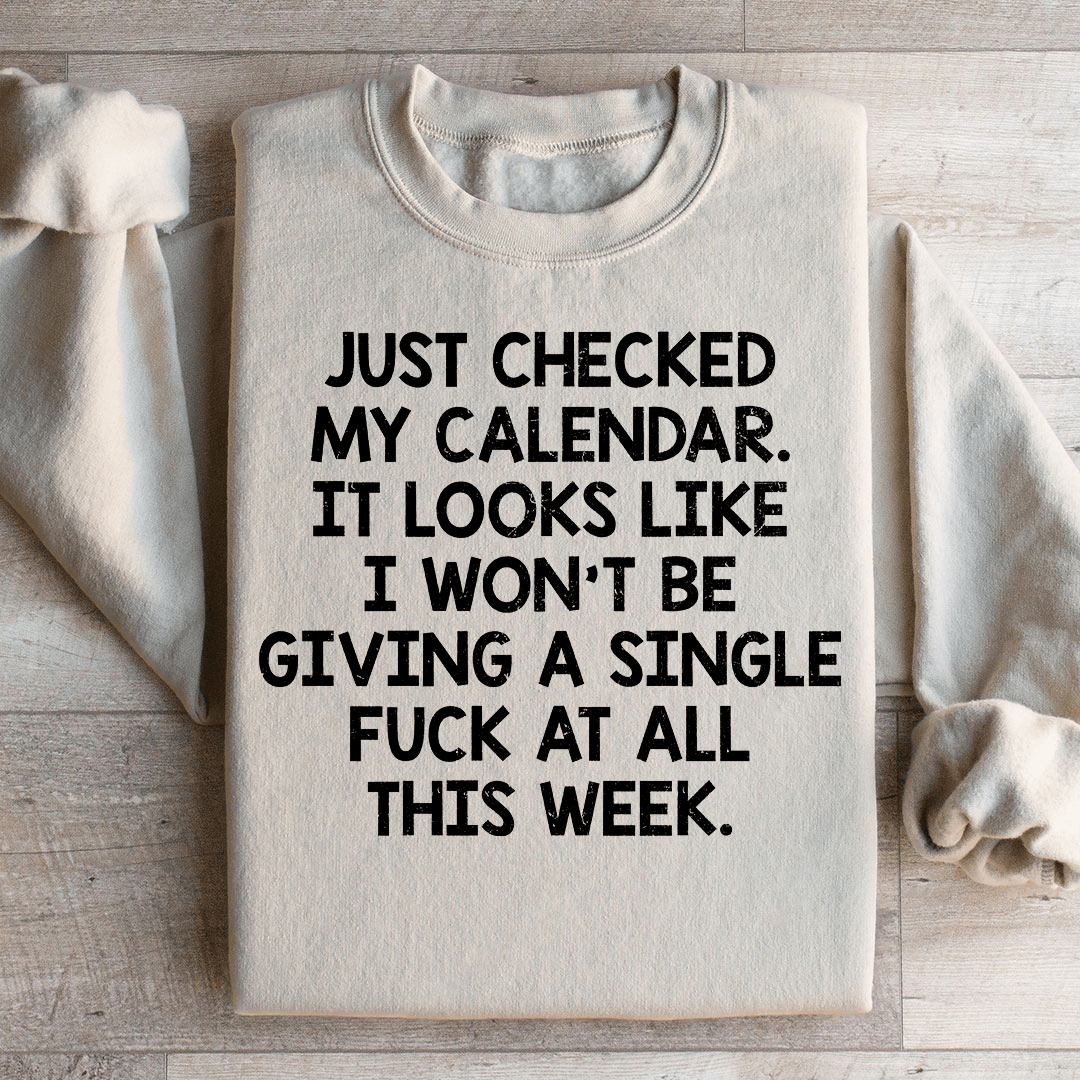 Whether you're conquering the day or taking a well-deserved break, our "I Just Checked My Calendar" sweatshirt has got your back. Wear it with a chuckle and embrace the beautifully chaotic journey of modern life. Grab yours today and let it be a conversation starter for fellow calendar warriors!.