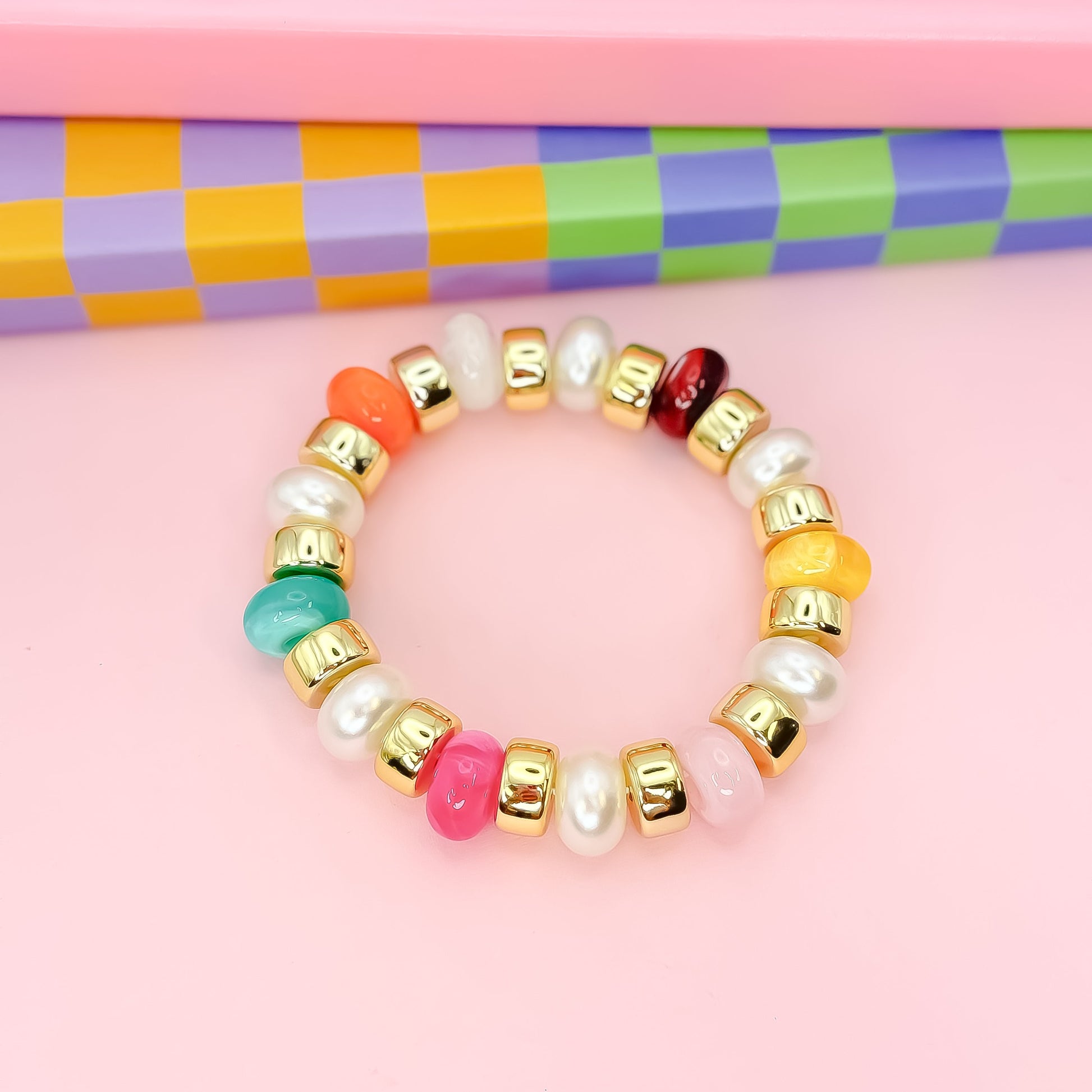 Bright, bold, and totally beaming — the Joyful Beaded Bracelet is a celebration of color and shine! Featuring glossy pearls, colorful beads, and luxe gold accents, this stretchy statement piece is designed to lift your mood and light up your look. It’s happiness you can wear, all wrapped around your wrist!