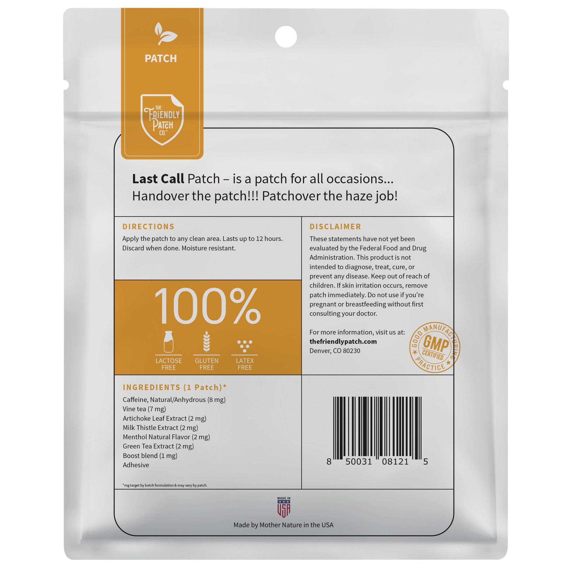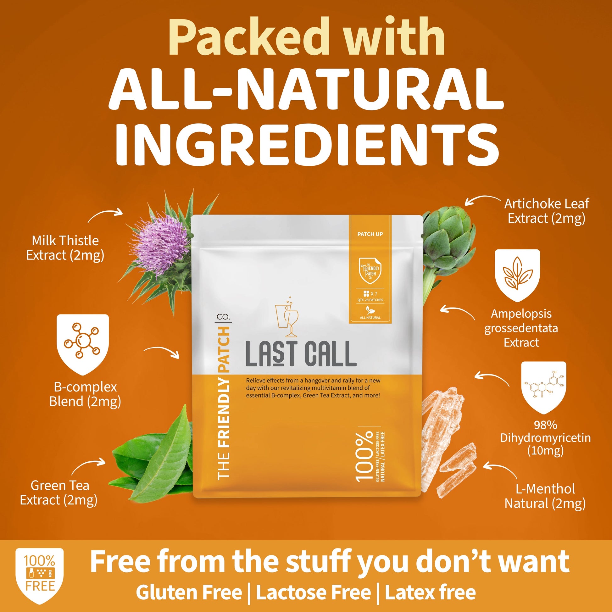 The Last Call patch contains natural ingredients such as green tea extract, B Blend, Milk Thistle Extract, and Artichoke Leaf Extract.