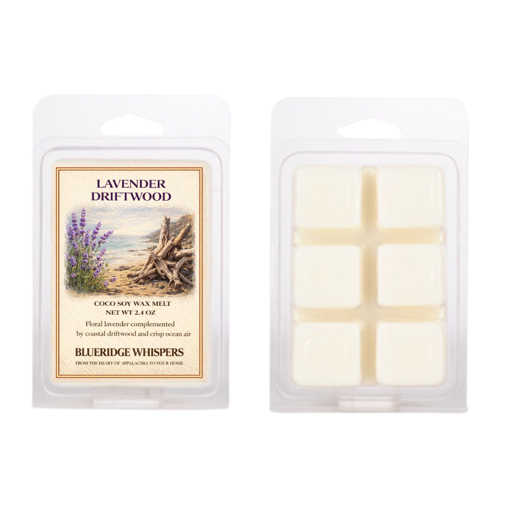 There’s a moment just after dawn in the holler when the mist lifts off the ridge, the porch is quiet, and the smell of lavender drifts on the breeze from the garden beside the cabin. At the same time, there’s the scent of weathered wood, tide-worn and softened by years of moonlight and sea air. That gentle balance of calm and depth is what we’ve captured in Lavender Driftwood, our hand-poured coco-soy wax melts crafted by Blue Ridge Whispers.