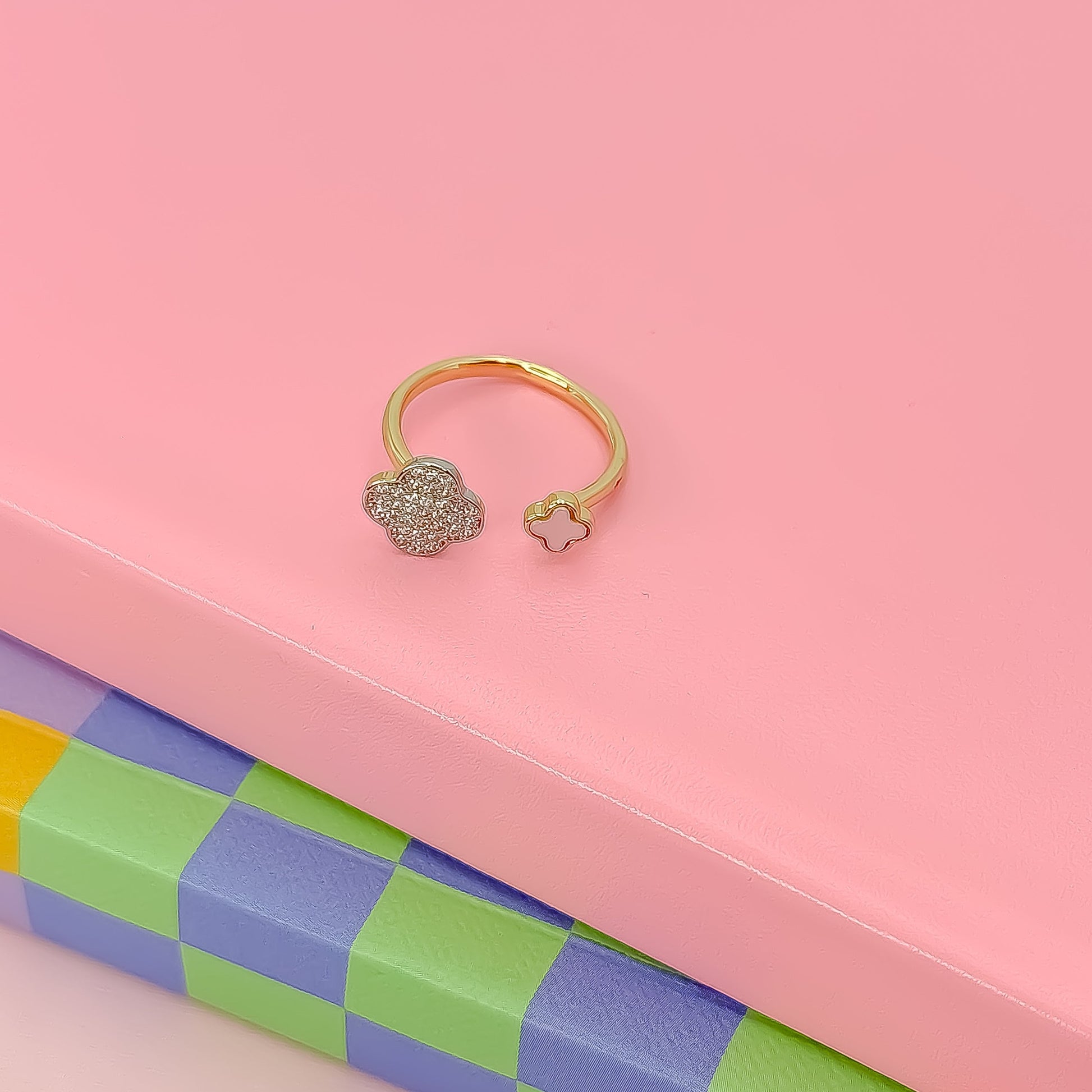 - A stylish open ring featuring to clover-shaped charms-one with sparkling stones.