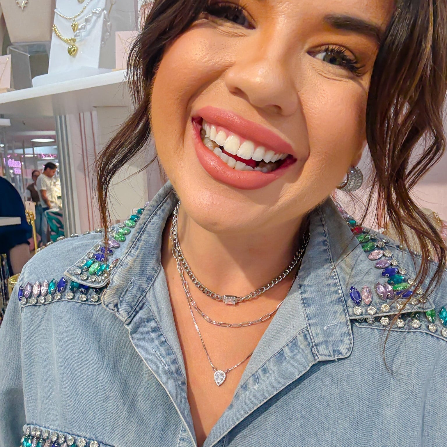 • Three layers, one fierce vibe. This silver statement necklace mixes bold chains and glimmering gems for a stacked look that’s totally on trend.