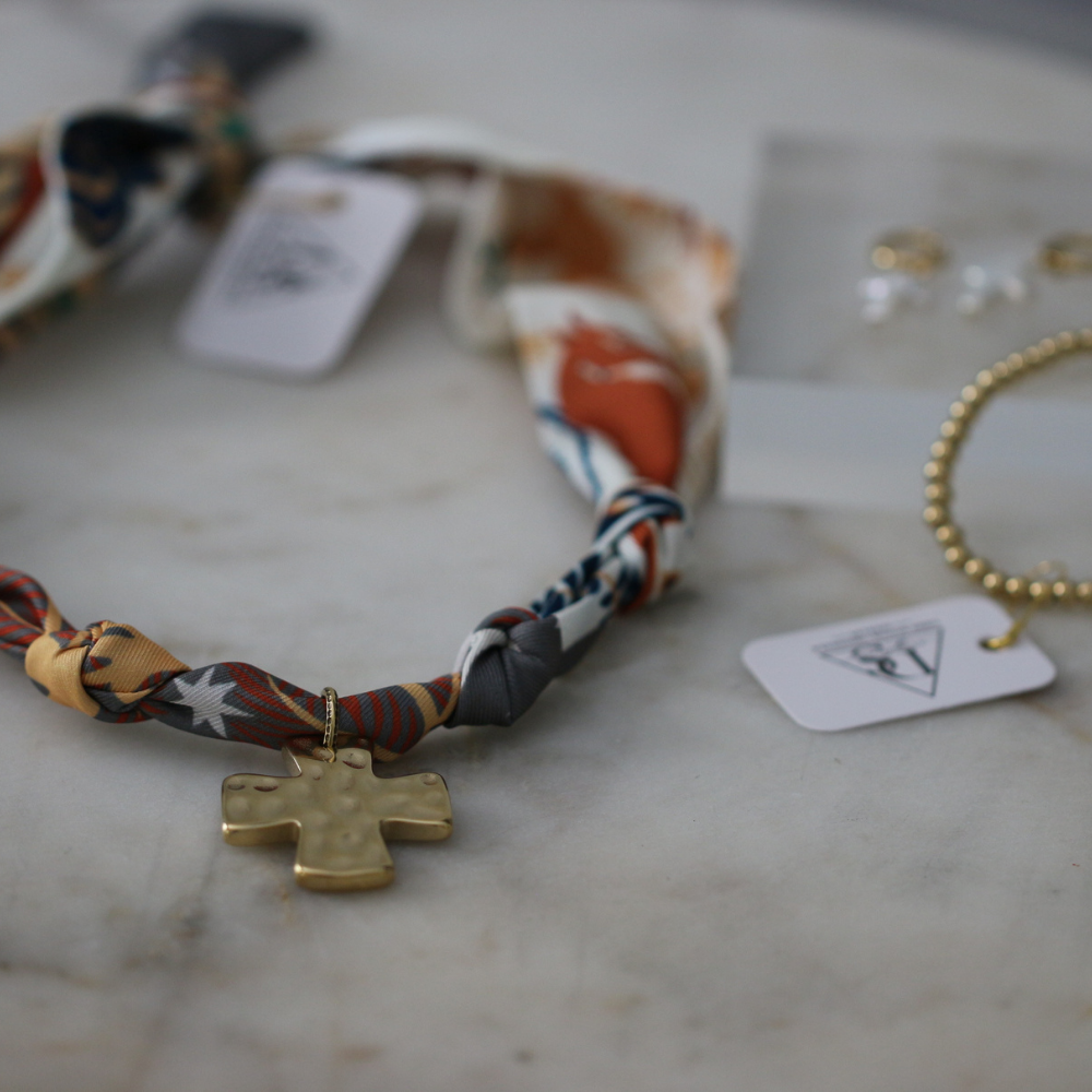 The Mountain Morning Scarf Necklace features a hammered gold cross pendant suspended from a richly patterned silk-blend scarf with a fall forest print, in 18k gold-plated brass, perfect for adding faith-inspired sophistication to any look. This statement necklace adds rustic charm and works beautifully worn as a necklace or tied around hair or bag for a curated, woodland style.