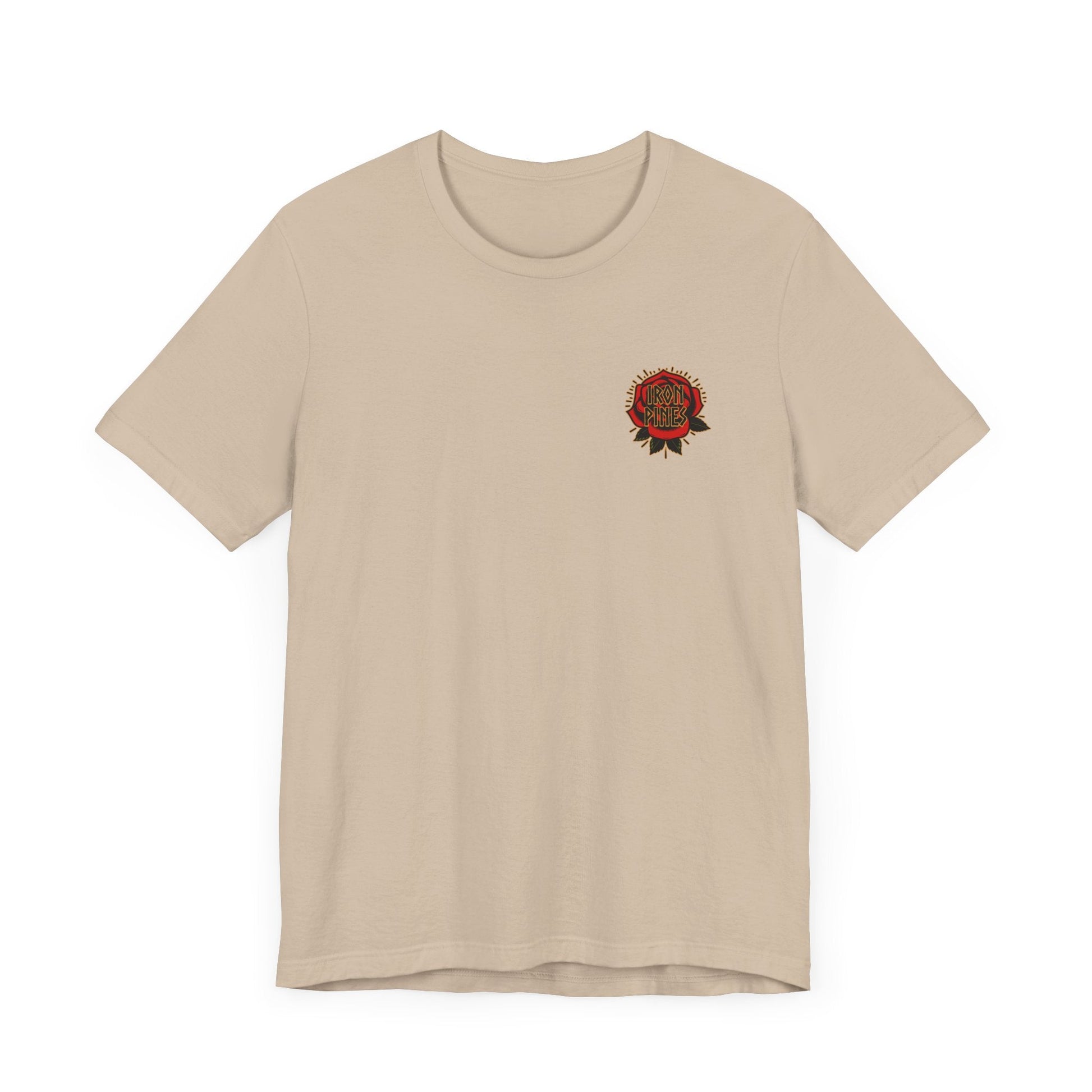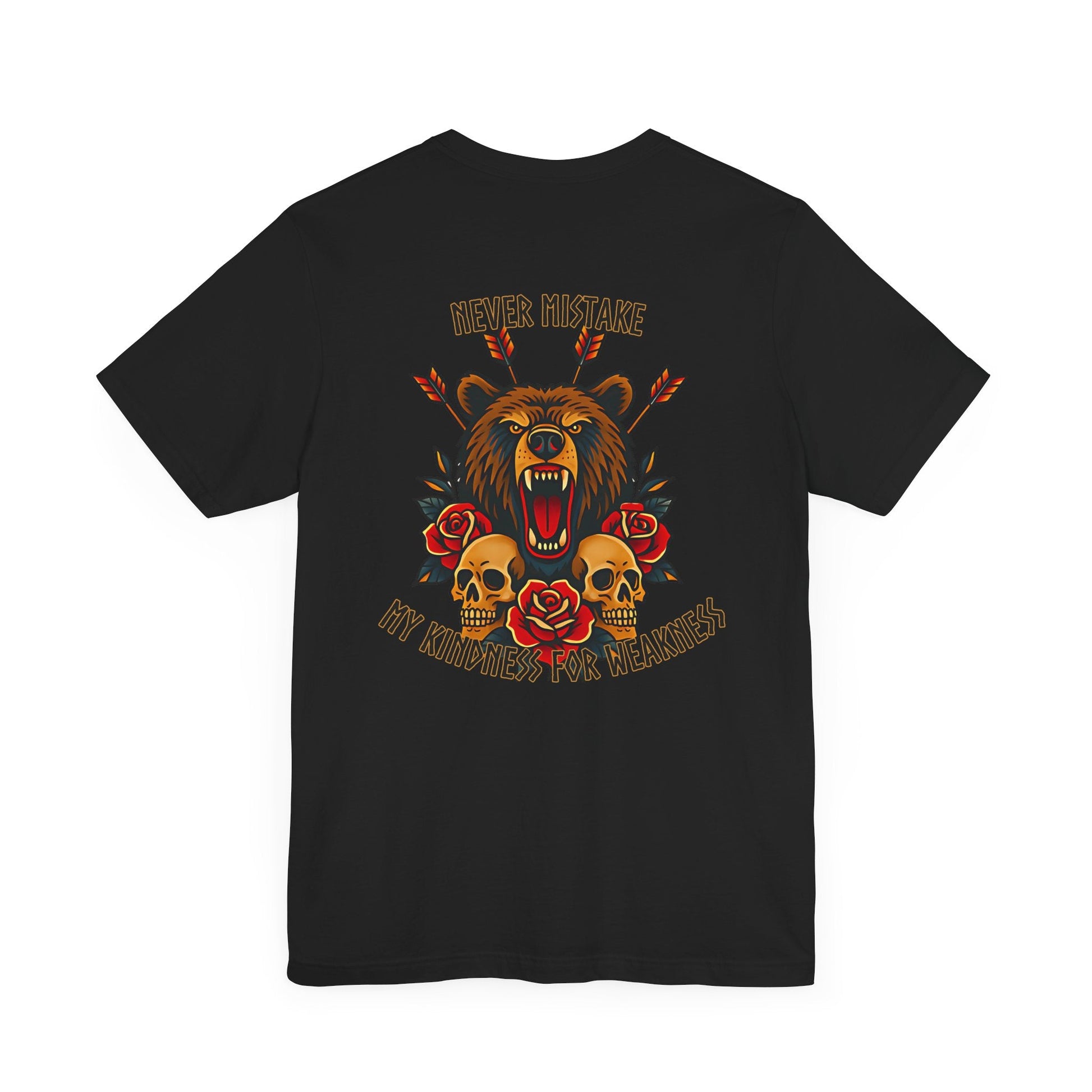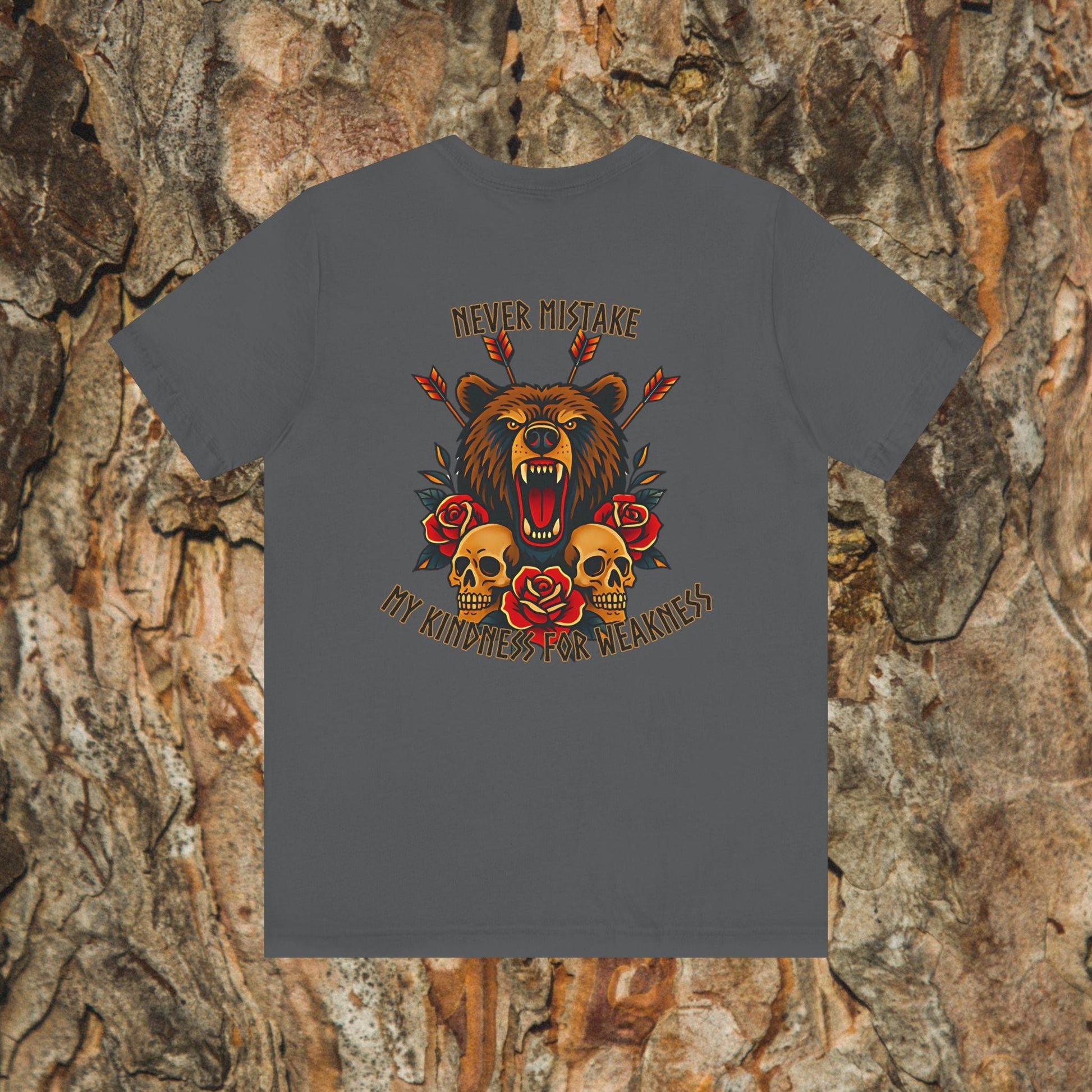 The front keeps it clean with a subtle rose and Iron Pines wordmark graphic over the heart. But turn around, and it’s pure fire: a fierce bear head roaring between crossed arrows, roses, and skulls, under the hard truth — "Never Mistake My Kindness For Weakness."