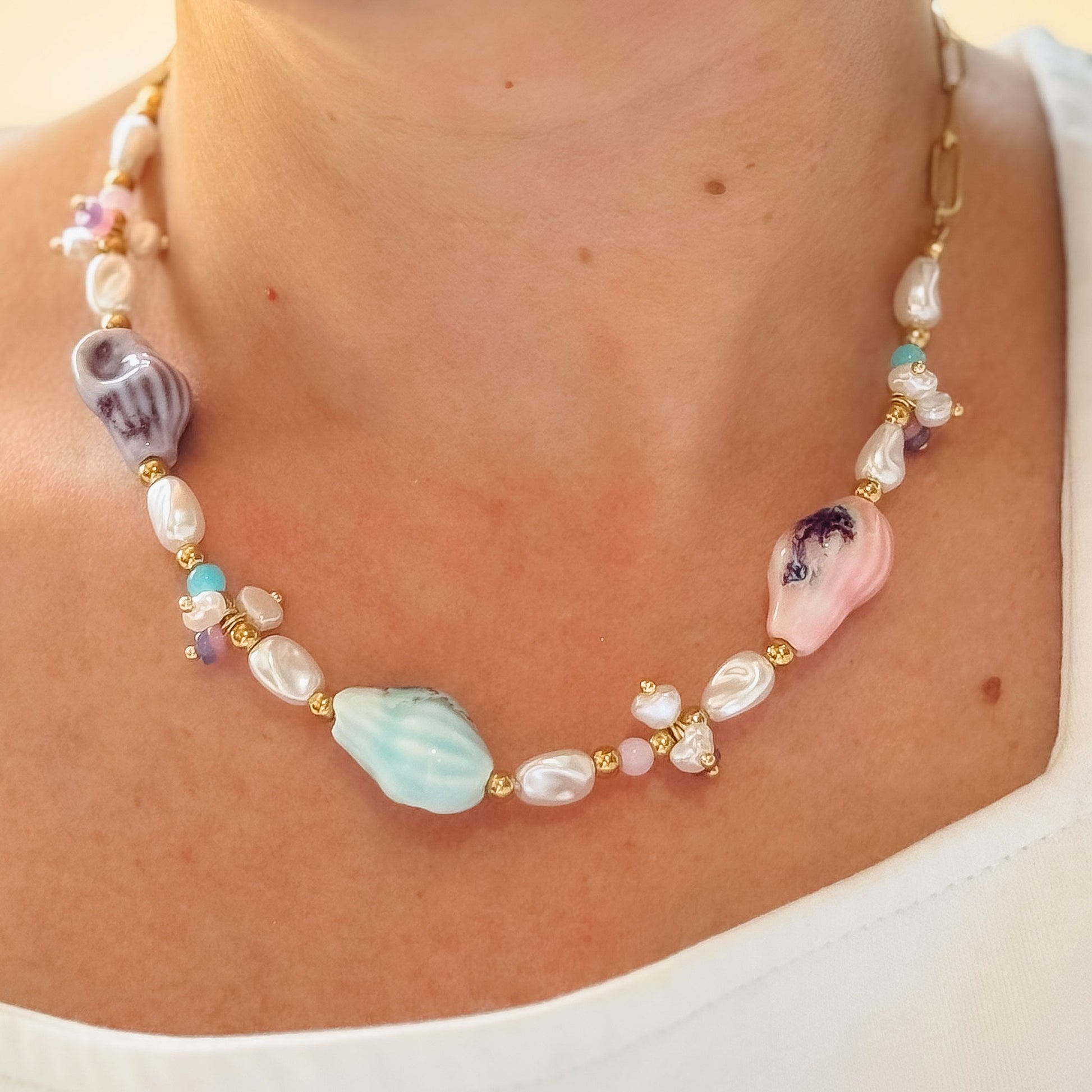 - Sweet, dreamy, and full of texture. Featuring soft swirls of pink, blue, and lilac resin. beads, paired with lustrous faux pearls and gold accents. A playful statement with seaside vibes.
