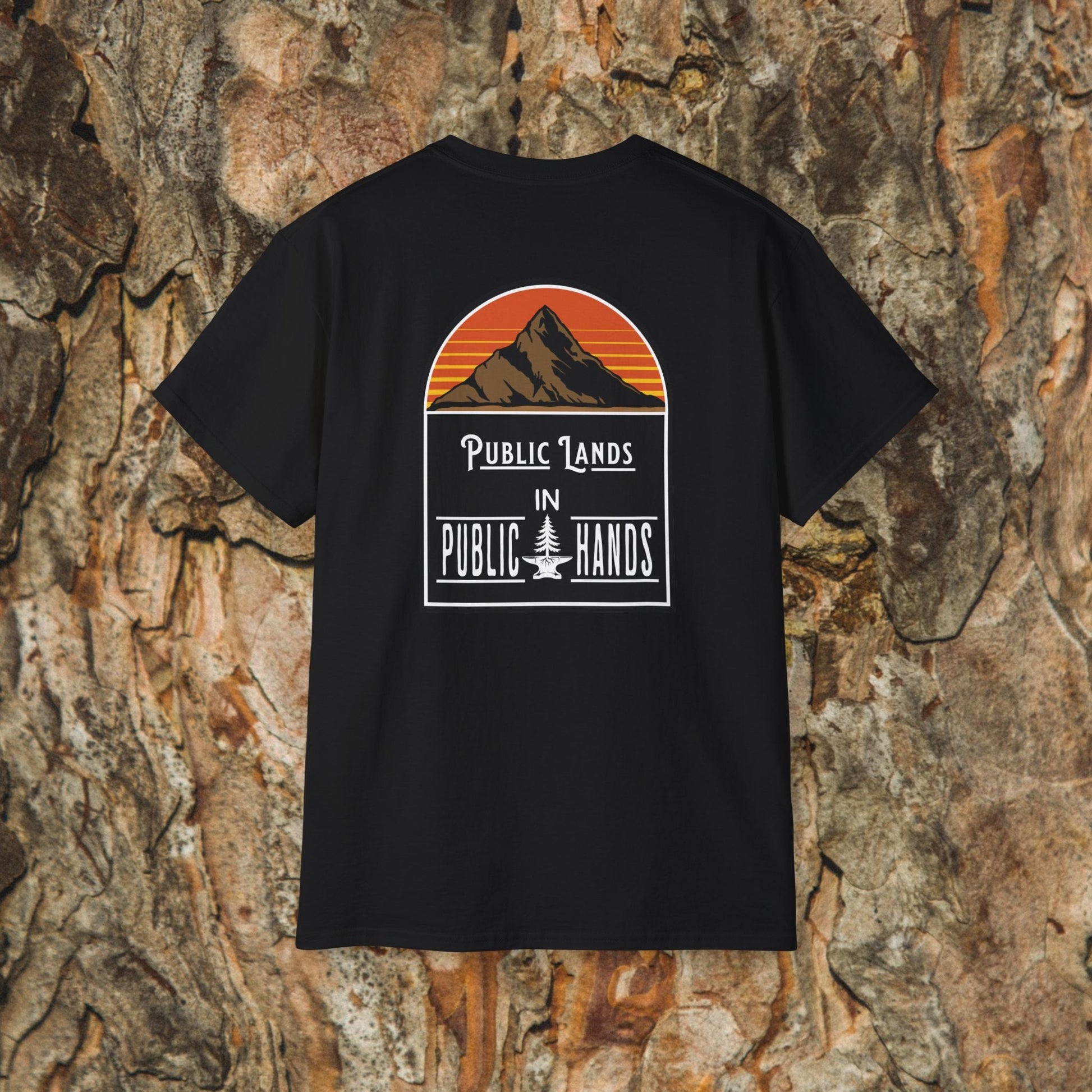 “Public Lands in Public Hands” — stamped over a sunset and jagged ridgeline, because subtlety never saved a forest.