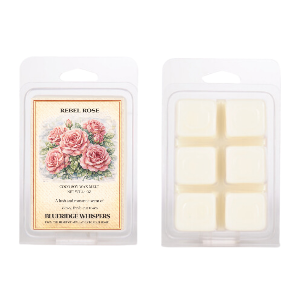 In the holler, when the last of daylight fades and the lantern flickers by the porch, there’s a memory of old-garden roses in bloom, their petals soft in the dusk and the scent drifting through the mountain air. That moment is what we captured in Rebel Rose, our hand-poured coco-soy wax melts by Blue Ridge Whispers — small-batch, full of character, and made to carry the scent of wild elegance into your space.