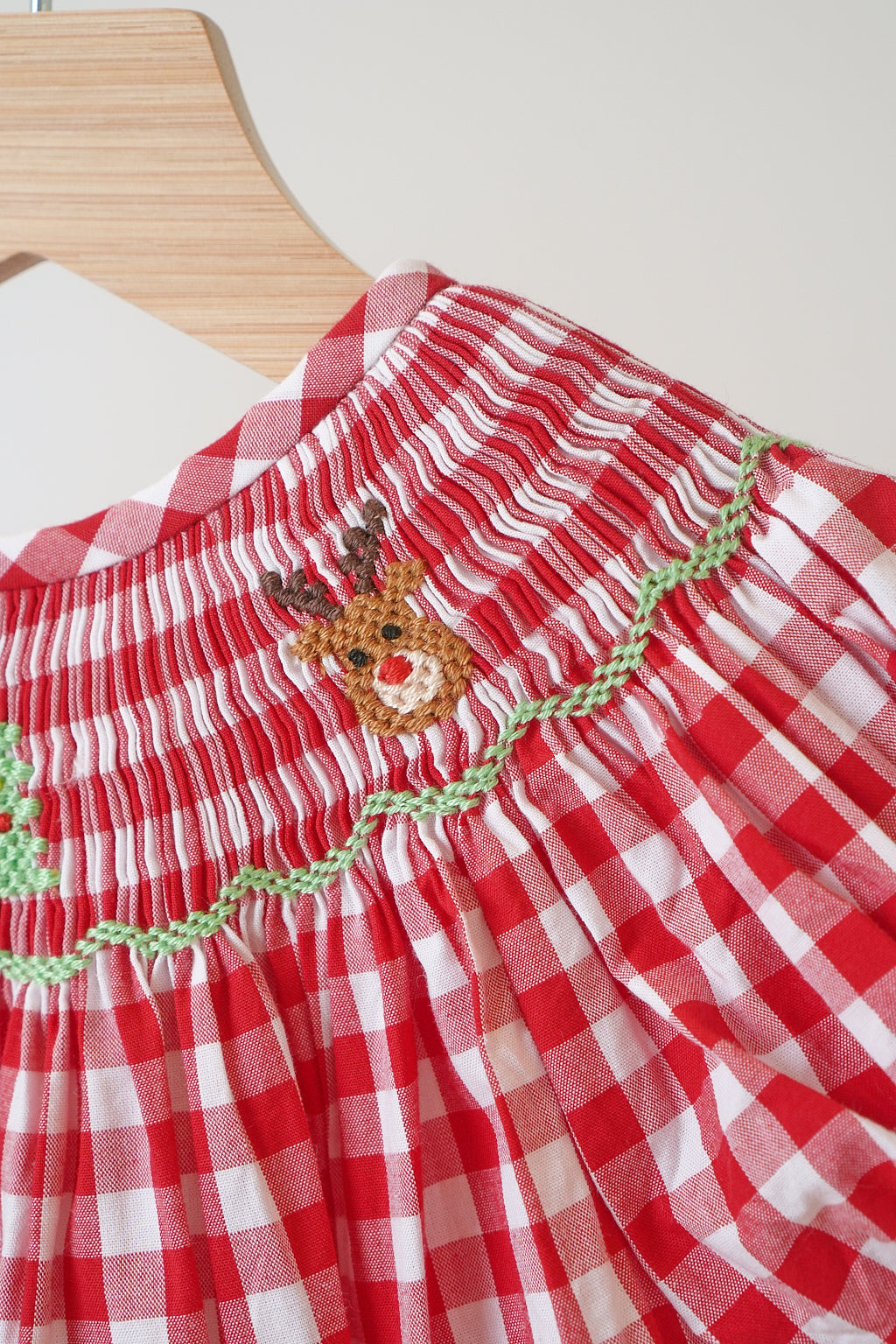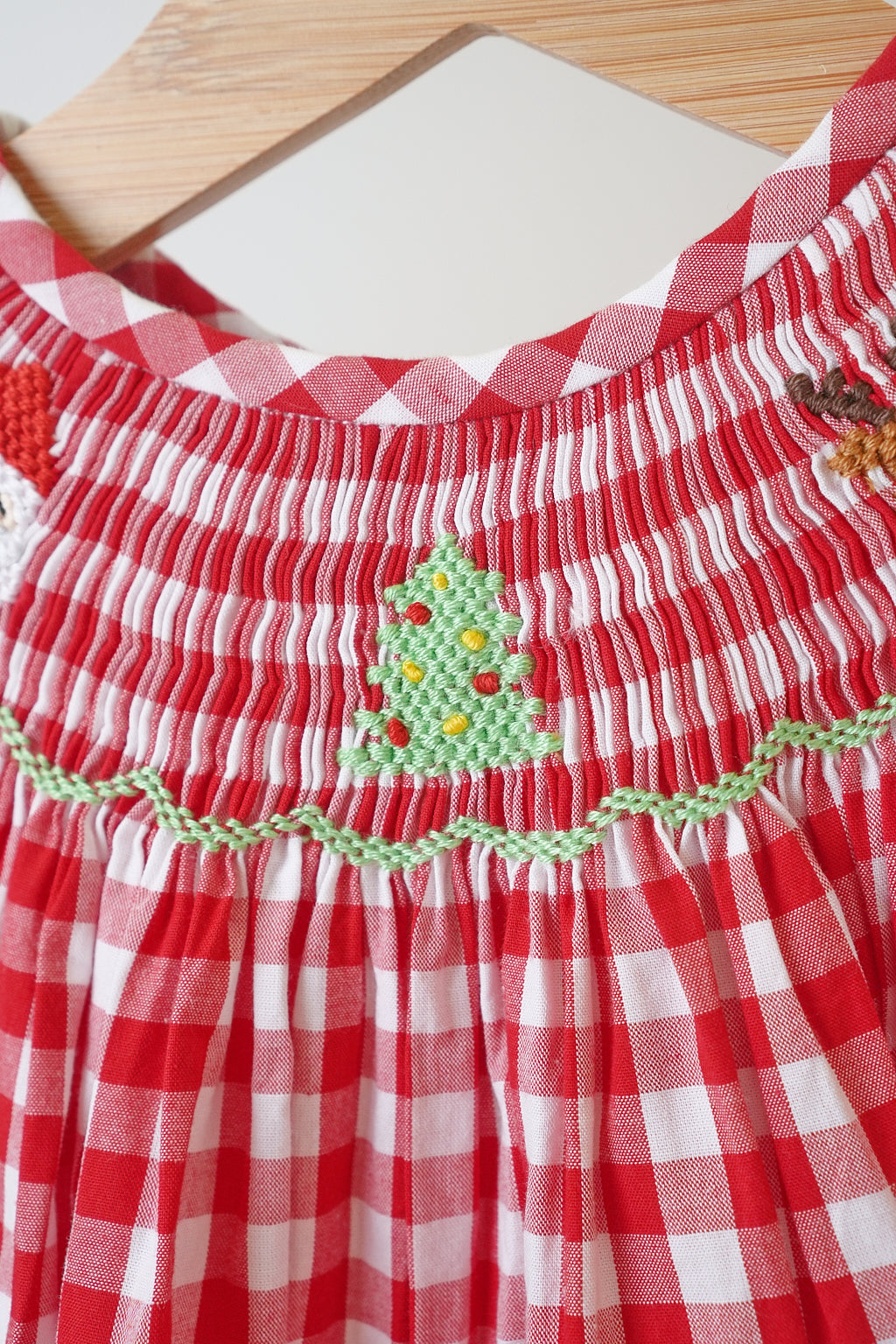 Red chrismtas santa tree reindeer hand smocked gingham romper