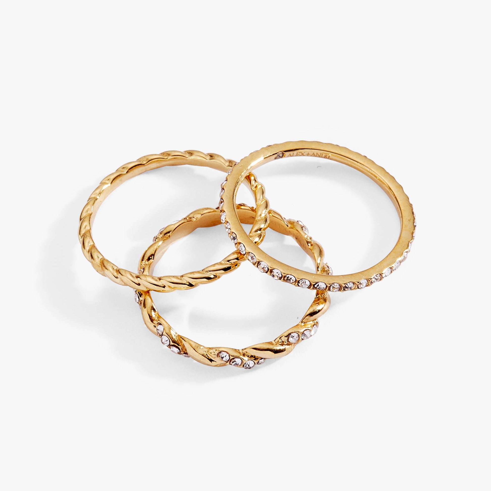 Add a little sparkle with this stacking ring trio! The first ring features a delicate rope texture, the middle shines with clear crystal pavé, and the third combines rope texture and pavé for extra flair. This ready-to-wear set makes stacking rings fun and hassle-free—because why guess when you can glow?