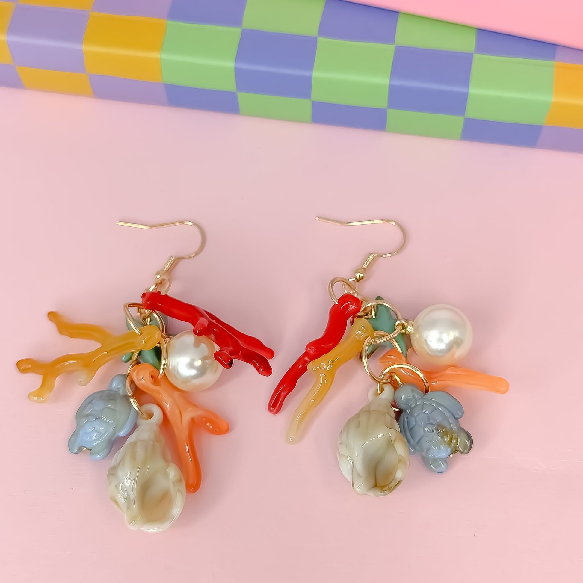 - Make a splash with this dreamy drop of ocean inspired magic. These playful dangle feature colorful coral shapes, sweet little sea turtles, glossy pearls, and tiny seashells, all swaying from a gold hook.