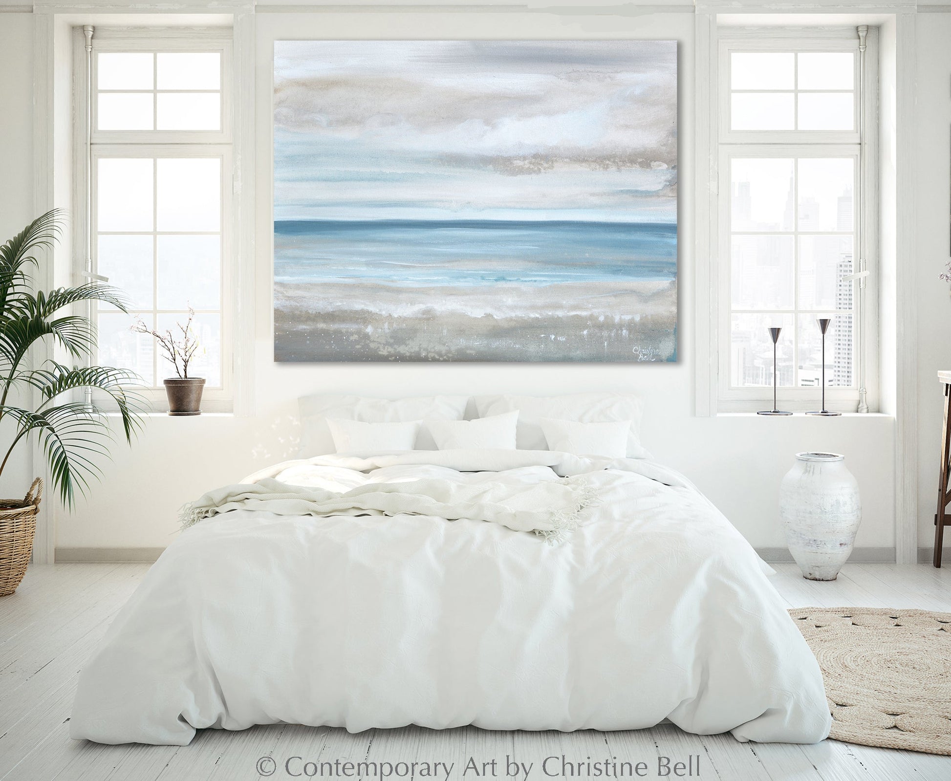 "Sea Salt" Giclée Print / Canvas Print Fine Art of Coastal Abstract Seascape Painting. Stunning, modern, ocean painting depicting contemporary impressions of the sea, waves, beach and clouds in abstract form. The serene shades of fresh ocean blue, soft light blues, creamy neutrals and crisp white, and multiple layers of paint give rise to beautiful watery abstraction that seems to subtly take on the depth and relaxed feel of the coast, sea and gentle waves. Contemporary, modern, California, coastal, gallery fine art. Beautiful wall art, perfect for contemporary coastal style / modern home decor.