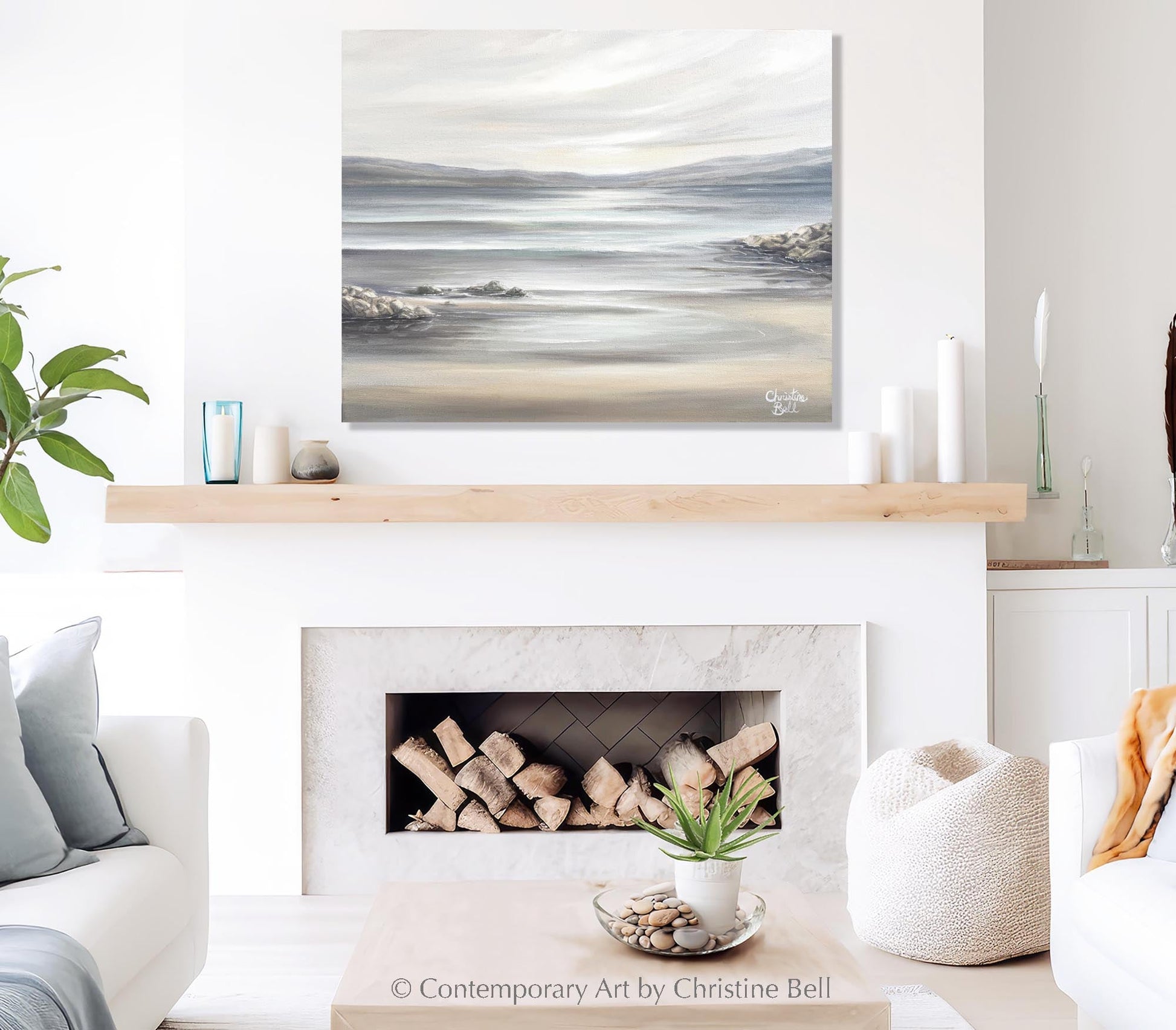 "Seaside Lullaby" Giclée print / Canvas Print of Original Coastal Seascape Oil Painting. Modern, impressionist fine art painting depicting idyllic beach and ocean tide pool. Lulling, gentle waves roll in, past the beach rocks, reflecting the atmospheric sky as the play of light and shadows, soft coastal clouds, reflecting waters and movement of the waves allow the mind to be transported into the peaceful rejuvenation of the sea. Contemporary, modern, gallery art by Fine Artist, Christine Bell. A stunning, beautiful piece of artwork perfect for a special gift, a gallery wall and for any classic style / elegant home decor.