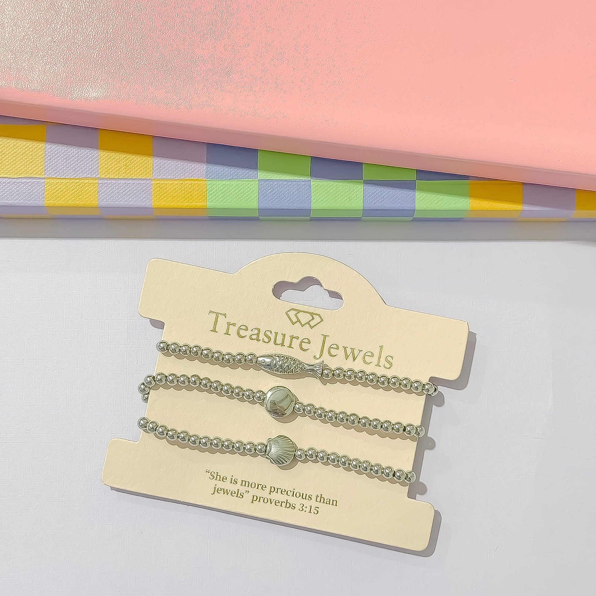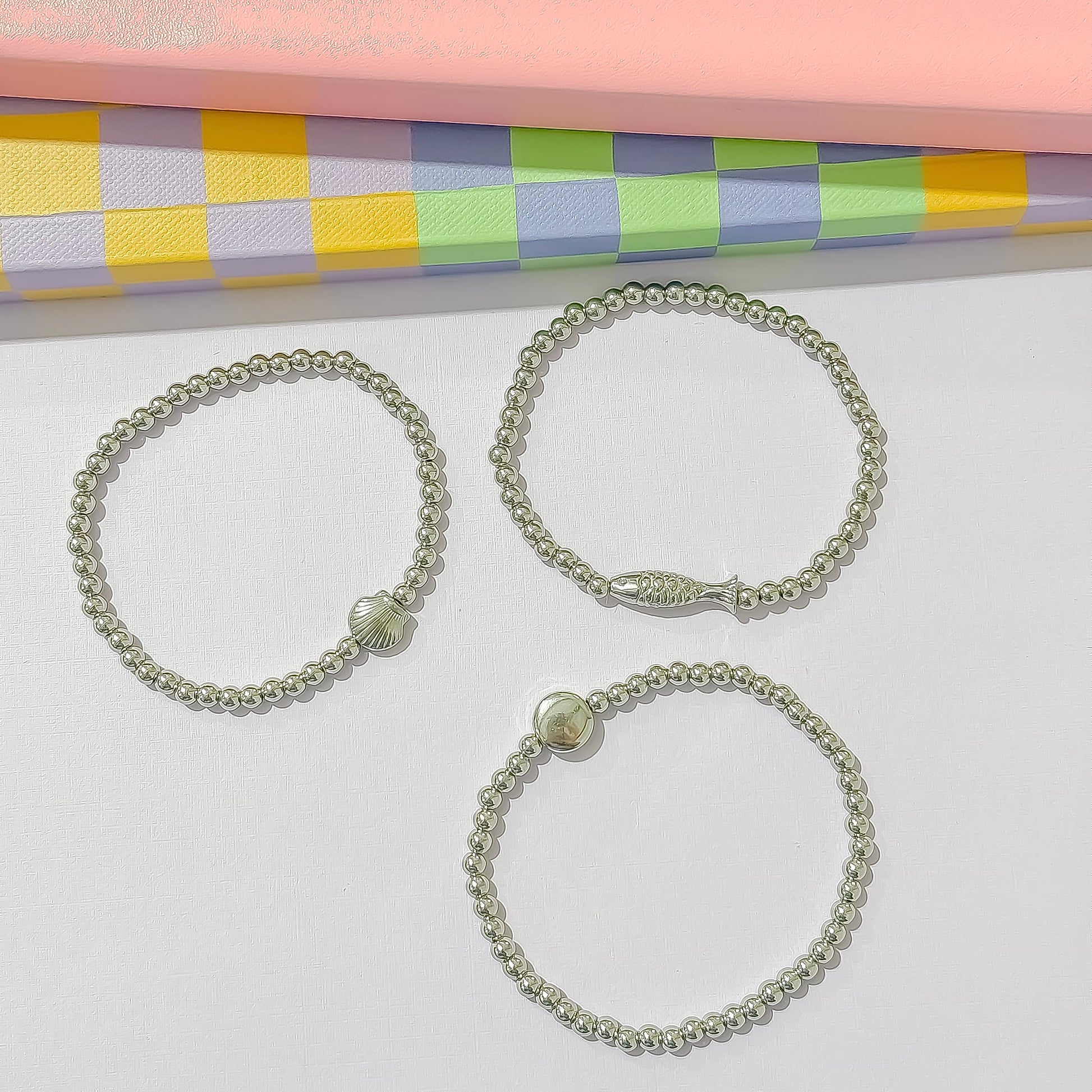 - A charming set of three gold beaded bracelets featuring a dainty fish, a scallop shell, and a little bee.
