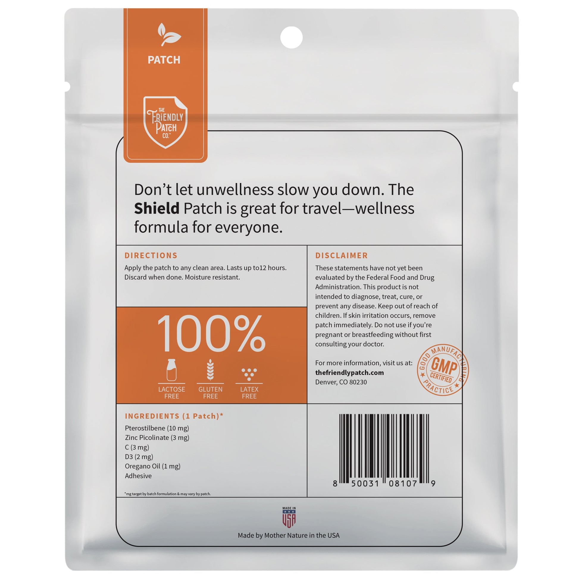 The Shield Patch is a unique product that combines a blend of natural ingredients, including Zinc, C and D3, Pterostilbene, and Oregano Oil, to provide various benefits for Wellness. These Plant-Powered patches are made in the USA without carriers, no fillers, no artificial flavors, no GMO’s.
