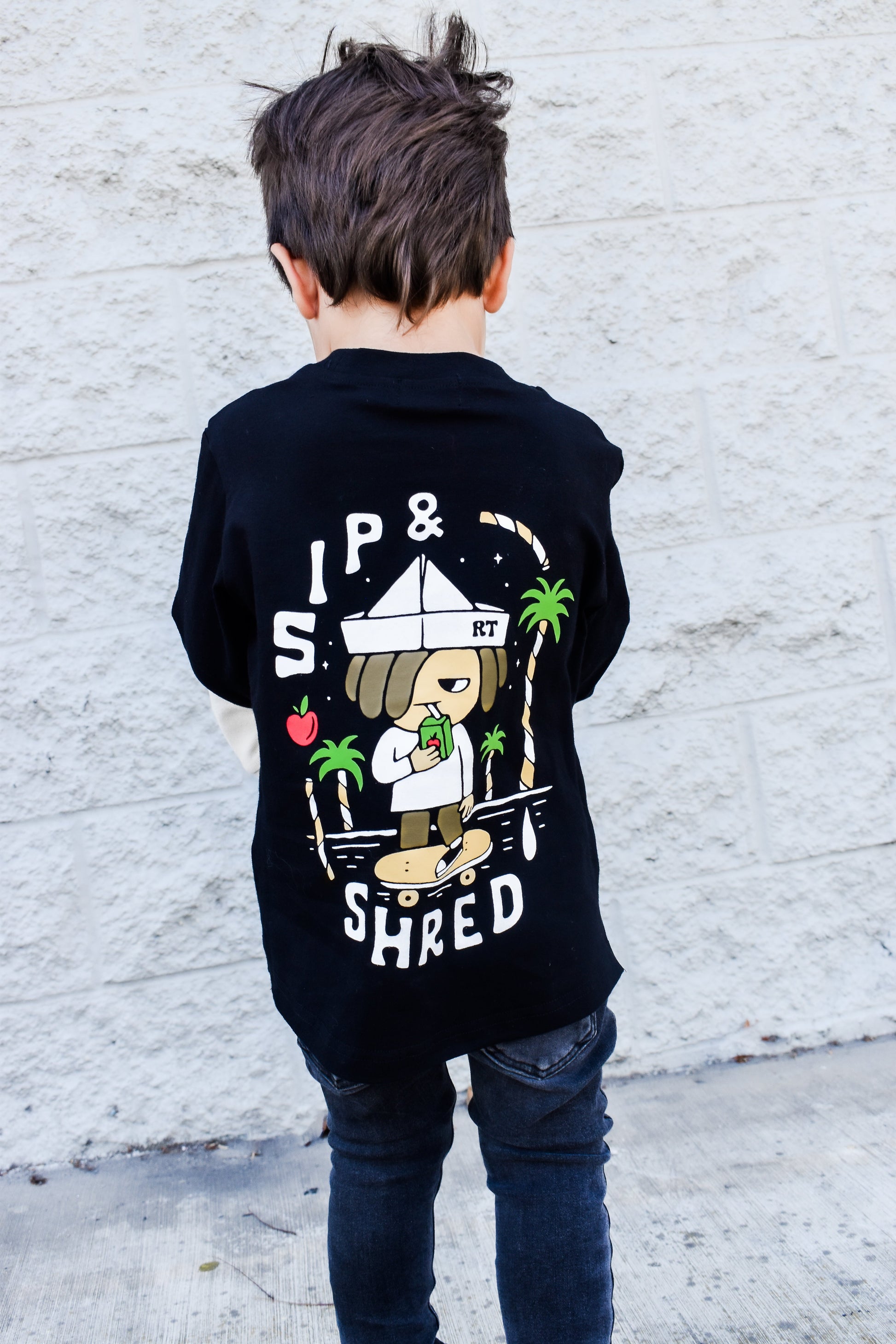 Juice box in one hand, skateboard in the other. The Sip & Shred long sleeve is made for the kids who balance playtime with style. Featuring a fun graphic of a little guy sipping juice and a board by his side, this black long sleeve is equal parts comfy and cool—perfect for school, skate sessions, or just kicking back.