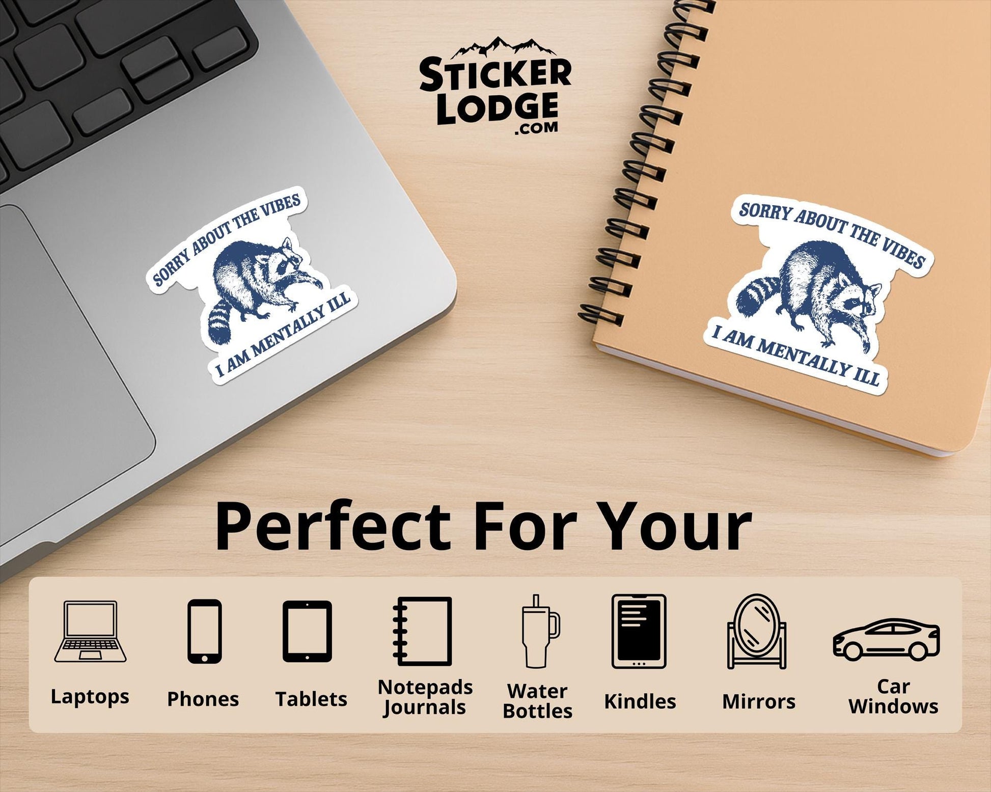 Our Sorry About The Vibes I Am Mentally Ill Vinyl Sticker is waterproof, durable, and perfect for personalizing your laptops, water bottles, phone cases, tablets, Kindles, planners, notebooks, journals, tumblers, mugs, mirrors, cars, motorcycles, and more!