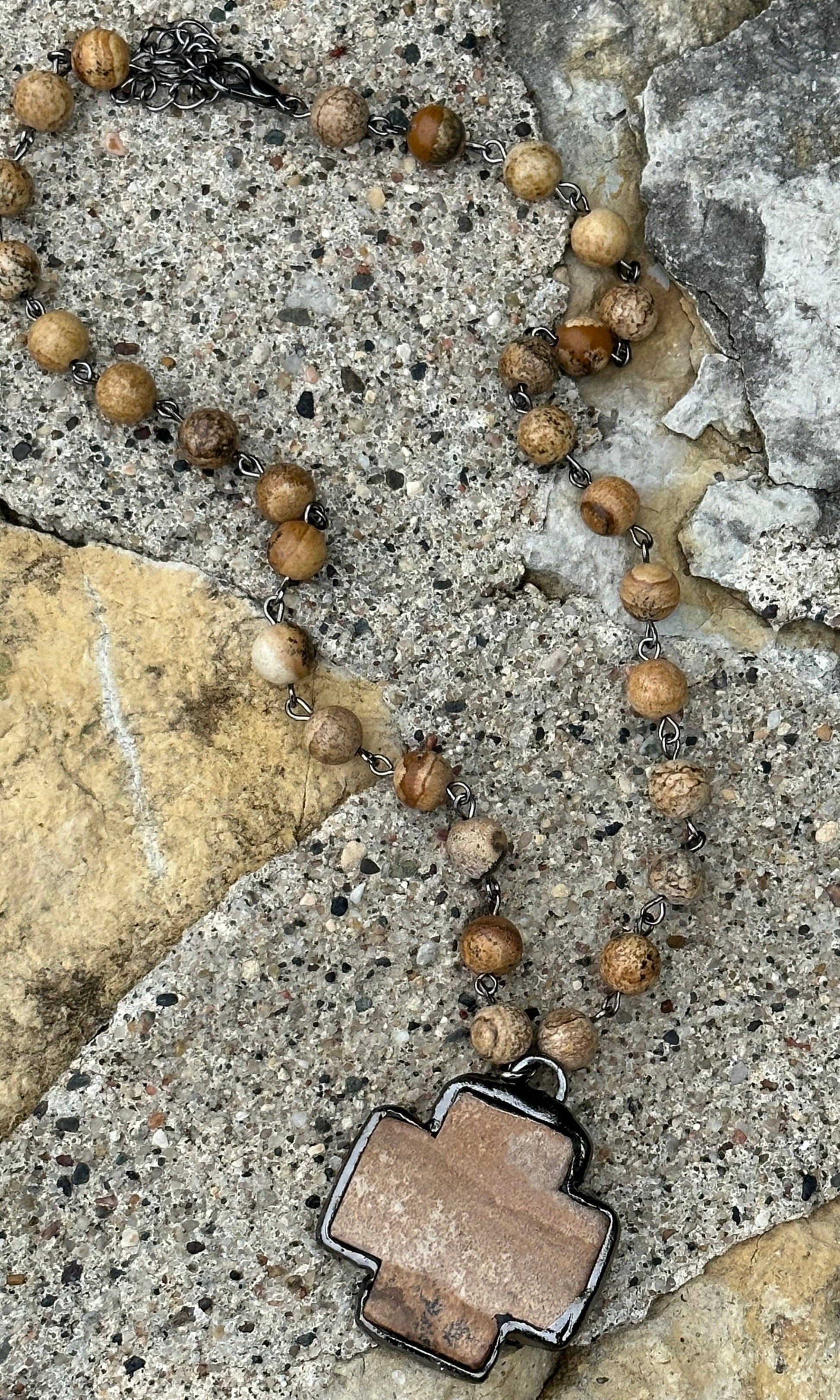 Color/stone options are sunset red, tan picture jasper and turquoise amonozite. Silver lobster clap and extender chain. 16"-17-1/2"l. Beautiful solder set stone cross design attached to natural stone rosary chain with a lobster closure. Pendant 2.5’ chain length 18”.
