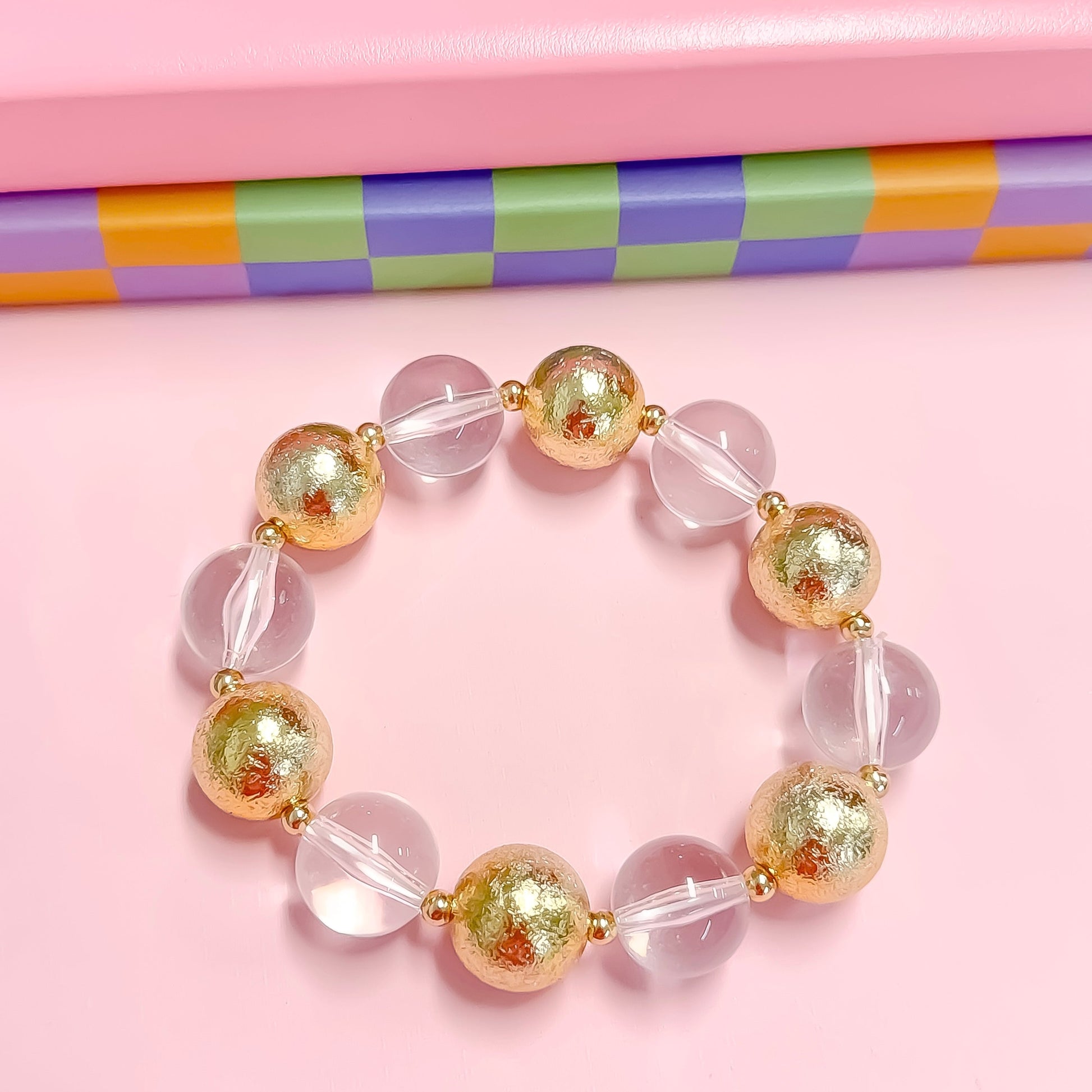 - Big sparkle, bold vibes — the Party Is Here Bracelet brings instant celebration to your wrist! Featuring oversized gold-flecked beads paired with crystal-clear accents, this stretchy statement piece is made to catch the light (and everyone’s attention). Fun, fabulous, and ready to turn every moment into a party!