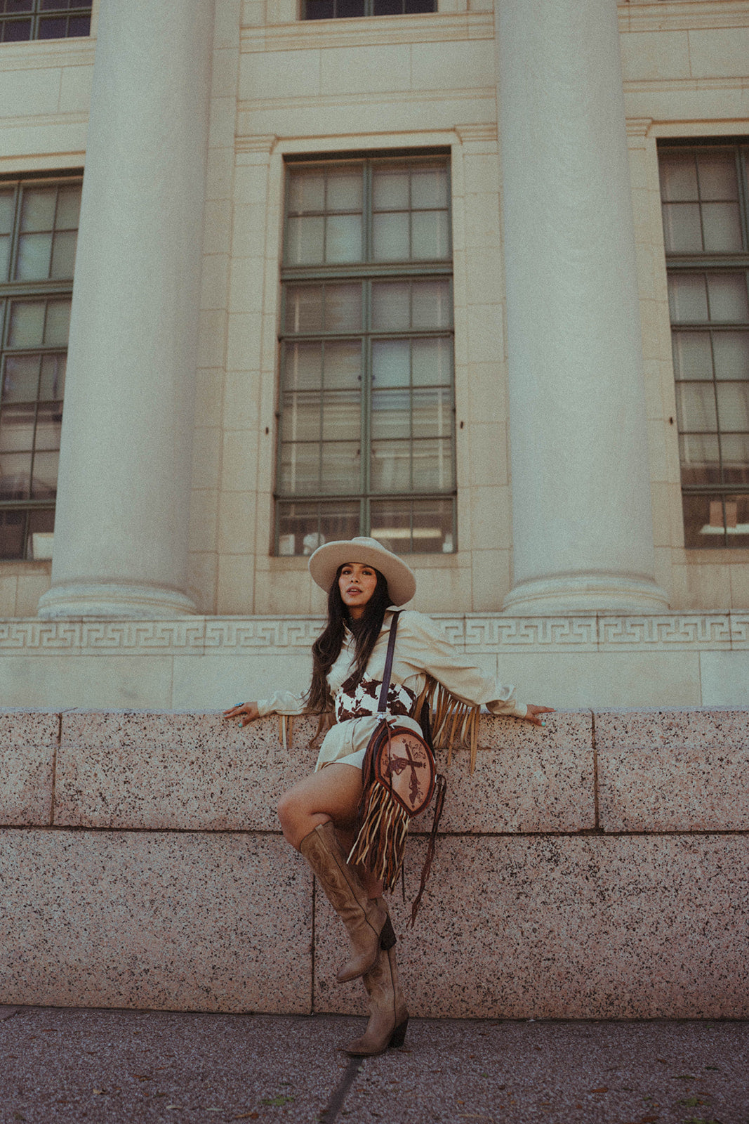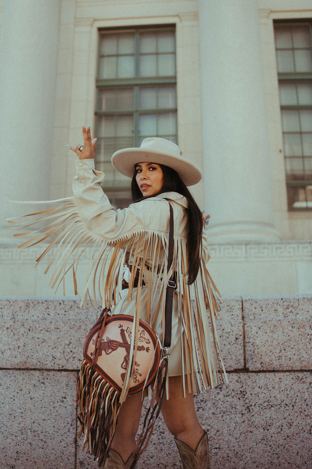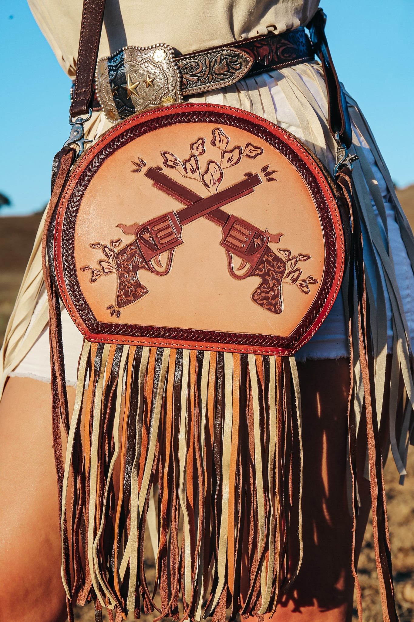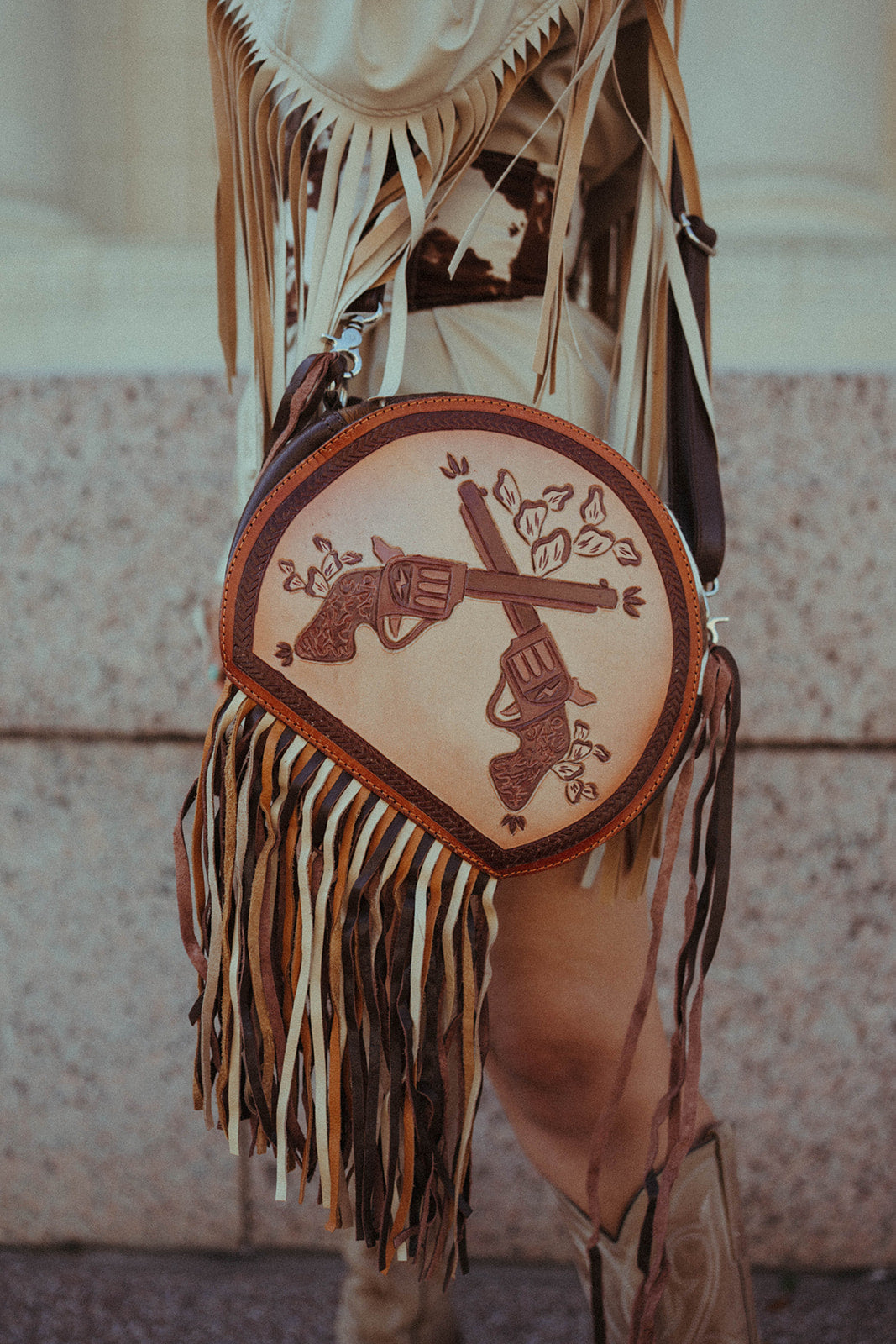 Introducing The Smoking Gun, a Haute Southern Hyde by Beth Marie Exclusive. The canteen shape accentuated with multi-colored fringe has Wild West written all over it. Shes bold, Innocent and yet Shrewd. Dive into Modern Day Western Luxury every time you open your bag and reach in to feel the beautiful Turquoise Velvet. Storage space includes one zippered pocket and one cubby pocket.