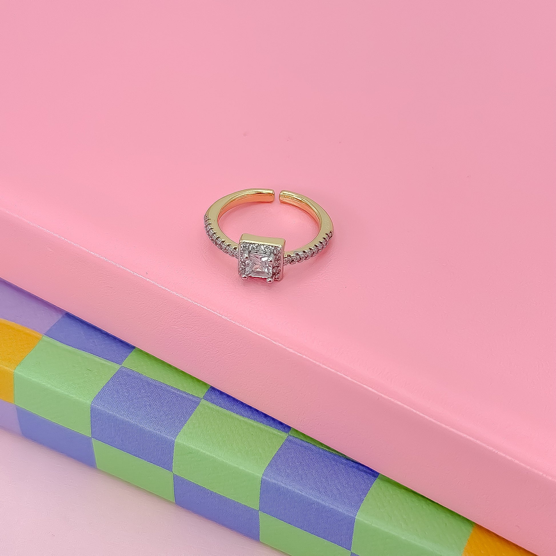 - A classic silver-tone ring with a sparkling square-cut center stone and a delicate crystal band.