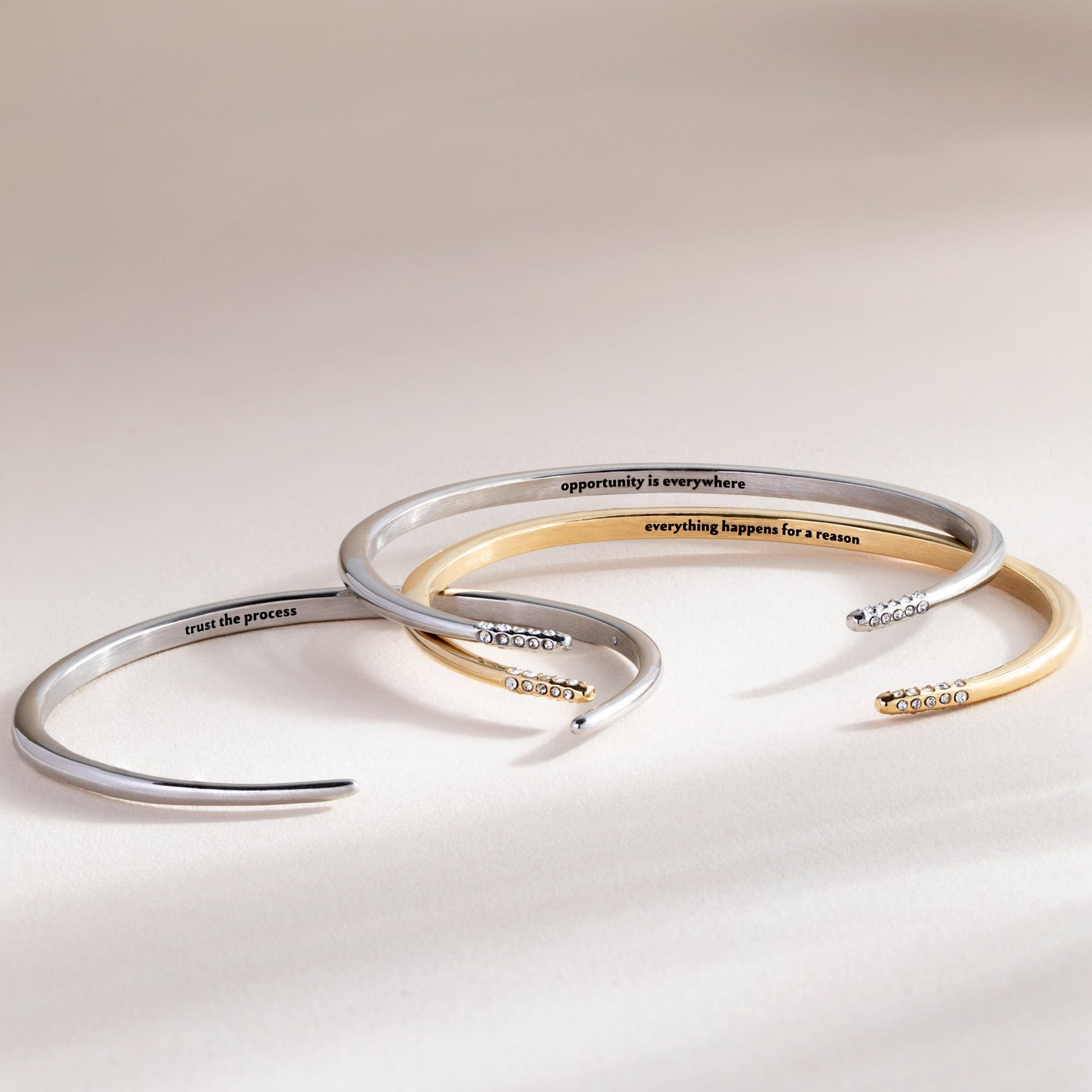 When you’re going through it, you’re going through it — but if you keep moving forward, you’ll make it to the other side. This bracelet is a silver-tone stainless steel open cuff bracelet, with tusk-shaped tapered ends encrusted in sparkling crystals. Inside, it’s engraved with the mantra “Trust the Process.” Because it’s stainless, this cuff is durable and scratch-resistant — so you can wear it as an everyday reminder to listen to your instincts and have faith that you’ll guide yourself where you need to be.