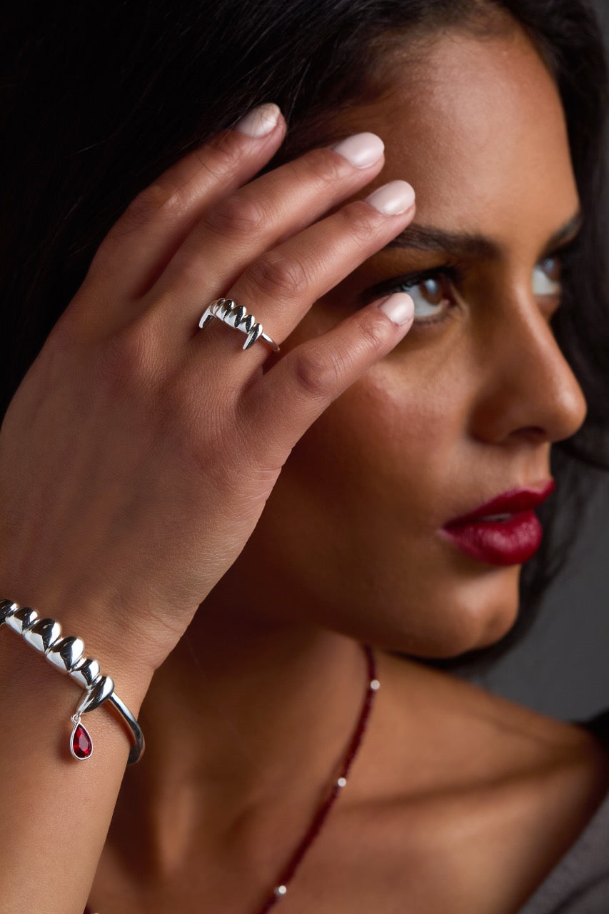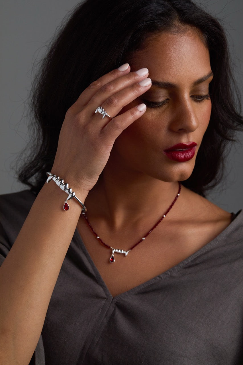 Sharp, sculptural, and unapologetically bold. This ring features a clean row of polished fangs that wraps your finger in edgy elegance. Whether you’re channeling your inner night creature or just love a little bite in your stack, this ring is your perfect match.
